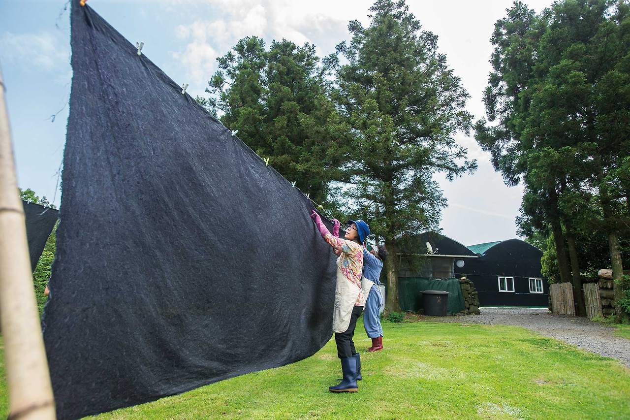 벚꽃과 유채꽃이 한가득 피어나 ‘한국의 아름다운 길 100선’에 꼽힌 녹산로. 봄철이 아니더라도 그곳을 찾을 이유는 충분하다. 넓은 초원과 듬성듬성 자리한 오름 사이로 가시리 풍력발전단지의 하얀 풍력발전기가 어우러져 이국적인 풍광을 연출하기 때문. 이곳의 정확한 지명은 서귀포시 표선면 가시리. 산간 마을과 해안 마을의 중간 즈음 자리한 중산간 마을로, 여름이면 초록빛이 완연하다. 그 풍경 언저리에 제주의 풀과 나무로 천연 염색을 하는 참곱다 농장이 있다. 큰사슴이오름과 입구를 공유하는 작은 농장 한편에서 제주 아주머니들의 천연 염색 체험이 한창이다. “선염을 통해 타닌을 입히고 나서 매염 작업을 해야 색이 선명하게 나와요. 손이 많이 가더라도 진한 색을 뽑기 위해서는 이 작업이 꼭 필요해요.” 상수리나무로 선염해 갈색을 띠는 천 위에 다시 구실잣밤나무의 검은 빛을 입히며 설명을 듣는다. 색의 농도에 따라 이런 과정을 네 번, 다섯 번까지 반복한다. 체험장 뒤로 삼나무 숲이 곧게 솟아 바람을 막아주고, 그 안쪽으로는 너른 잔디밭 위에 염색한 천이 마르고 있다. 고운 빛깔의 검정이 산의 초록빛과 어우러져 마치 제주의 지도를 펼친 것 같다.