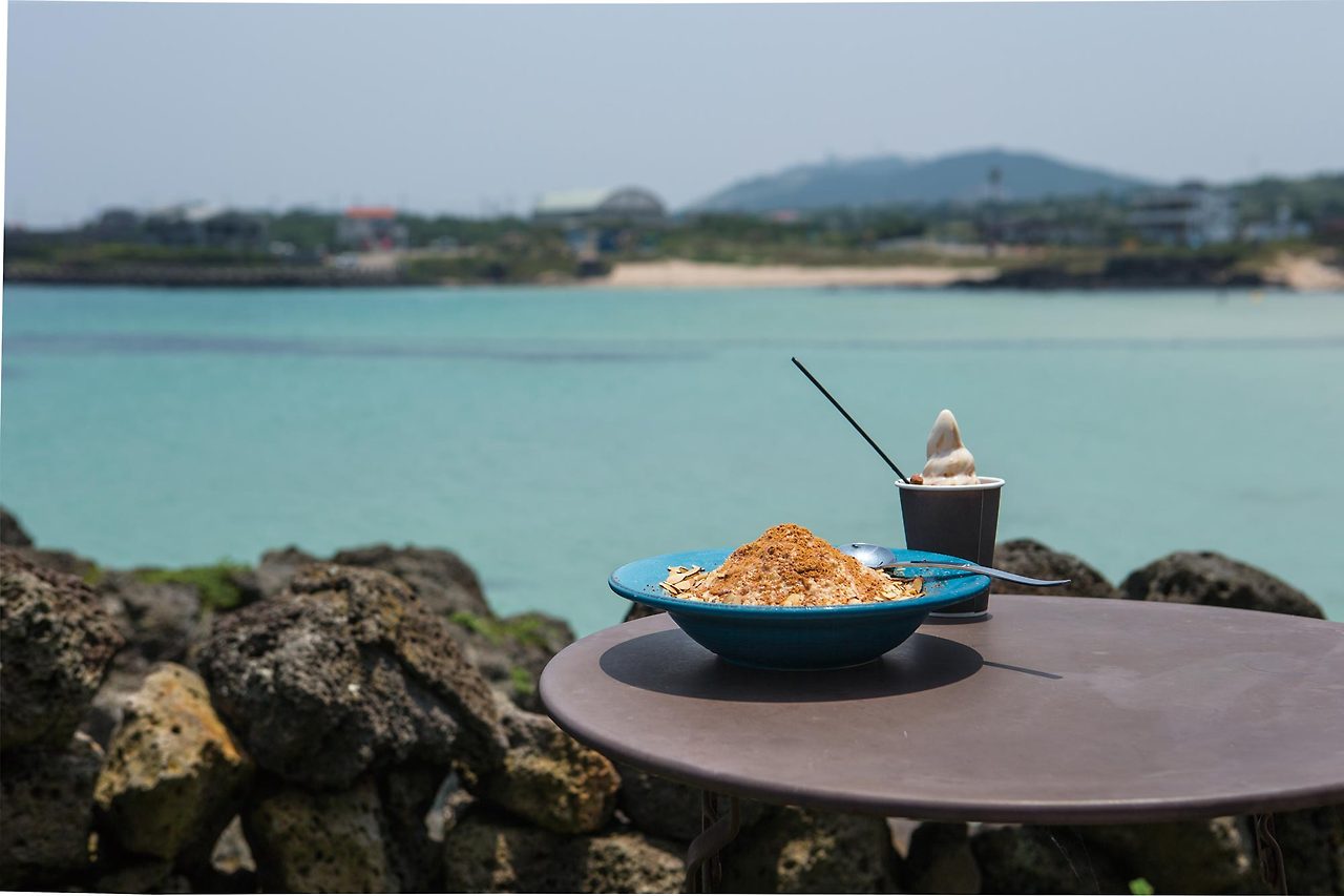 화산토로 이뤄진 제주 땅은 본래 논농사가 불가능하다. 비가 내리는 족족 빗물이 화산토로 쓸려 내려가니 씨가 건강하게 버틸 수 없는 것. 수로를 뚫어 맑은 폭포수를 끌어들인 개척 논의 역사가 있지만 현재 대부분 사라졌다. 쌀을 재배하기 어려워 메밀, 보리, 핍쌀, 수수, 조, 밀과 같은 잡곡 분말을 주식으로 고구마, 감자와 해산물 등 거친 식자재가 제주 밥상 차림이었다. 척박한 땅에서도 잘 자라고 성장이 빠른 땅콩을 우도에서 재배한 이유도 그 연장선에 있다. 1980년대 중반부터 땅콩을 재배하기 시작한 기록을 보면 역사가 길지 않지만, 오늘날 200여 개의 농가가 땅콩 농사를 짓고 수확한 전량을 판매하는 등 대표 특산물로 자리 잡았다. 그만큼 우도 땅콩을 주재료로 한 메뉴와 레시피도 다양하다. 어디에서나 땅콩을 쉽게 구할 수 있고, 땅콩 아이스크림, 땅콩 햄버거, 땅콩 호떡도 있다. 우도 북동쪽에서 만난 카페 블랑로쉐도 땅콩 메뉴를 판매하는 곳 중 하나. ‘하얀 바위’라는 뜻의 이름처럼 새하얀 박공 지붕의 외관이 인상적인 곳으로, 땅콩 아이스크림과 빙수가 유명하다. 옥빛 바다와 수평선을 이루는 널찍한 테라스가 건물을 둘러싸고, 전면 유리창을 오픈해 사방에서 바닷바람이 불어온다. 테라스와 자연스레 연결되는 현무암에 서서 사진을 찍는 관광객과 하고수동 해변을 바라보고 우도의 바다를 만끽하는 이들로 가득하다. 이국적인 공기가 교차하는 세련된 카페다.