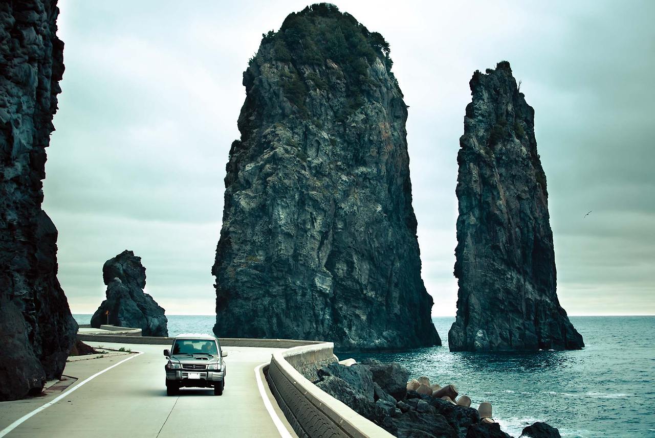 울릉읍 저동리에서 섬목까지 해안로를 조성하는 데 약 40년이 걸렸다. 나머지 구간도 올해 안으로 공사를 마칠 거라고 하지만 알 수 없는 일이다. 저동항에서 차를 렌트해 해안길을 따라 일주로의 끝, 섬목을 향한다. “와” “와” 연신 감탄을 쏟는 풍경이 이어진다. 한 치 앞 풍경을 예측하기 어렵다. 팔뚝만 한 베개 모양의 바위로 쌓인 용암 계단을 지나면 다양한 모양의 암석 조각이 포도알처럼 알알이 박힌 암벽이 등장하고, 고개를 들면 국수가락을 닮은 주상절리가 산 중턱에 병풍을 이루고 있다. 뾰족하게 솟은 바위는 그 경사가 가파르기도 하지만 해풍에 자갈이 툭 떨어지곤 해 섬뜩하게 놀란다. 도로를 향해 온몸을 뻗은 암벽을 지날 때마다 ‘낙석 주의’ 안내판이 보인다.