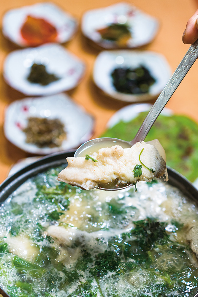 예구마을로 되돌아온 뒤, 항구 변 식당에서 저녁의 허기를 달래기로 한다. 마침 도다리가 적당하게 살이 오른 시기다. 향긋한 쑥을 넣고 뭉근하게 끓인 도다리쑥국은 경남의 남해안 일대에서 맛볼 수 있는 봄날의 별미. 부드럽게 씹히는 도다리 살과 쑥 내음 가득한 뽀얀 육수가 어우러져 공곶이에서 누린 봄기운을 이어가기에 충분하다.