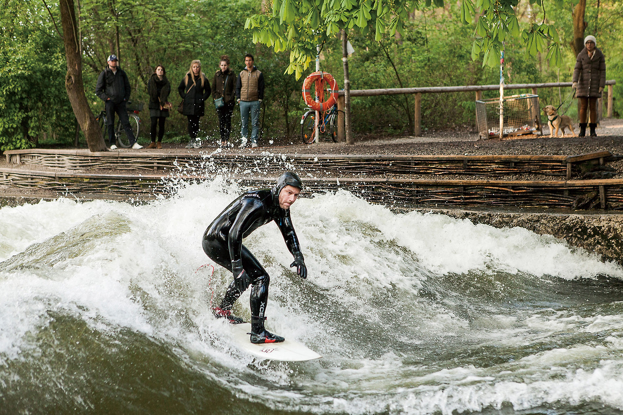 바다가 없는 내륙 도시 뮌헨에서도 서핑을 즐길 수 있다는 것을 아시는지? 바로 영국 정원(Englischer Garten) 남쪽의 아이스바흐에서 말이죠. 1970년대 좁은 둑을 따라 형성된 이곳 급류에서 누군가 서핑을 시작했고, 이후 입소문이 나면서 세계적 도심 서핑 명소로 떠올랐어요. 평일 오후에도 파도를 타기 위해 수많은 서퍼가 보드를 들고 긴 대기줄을 이루곤 합니다.