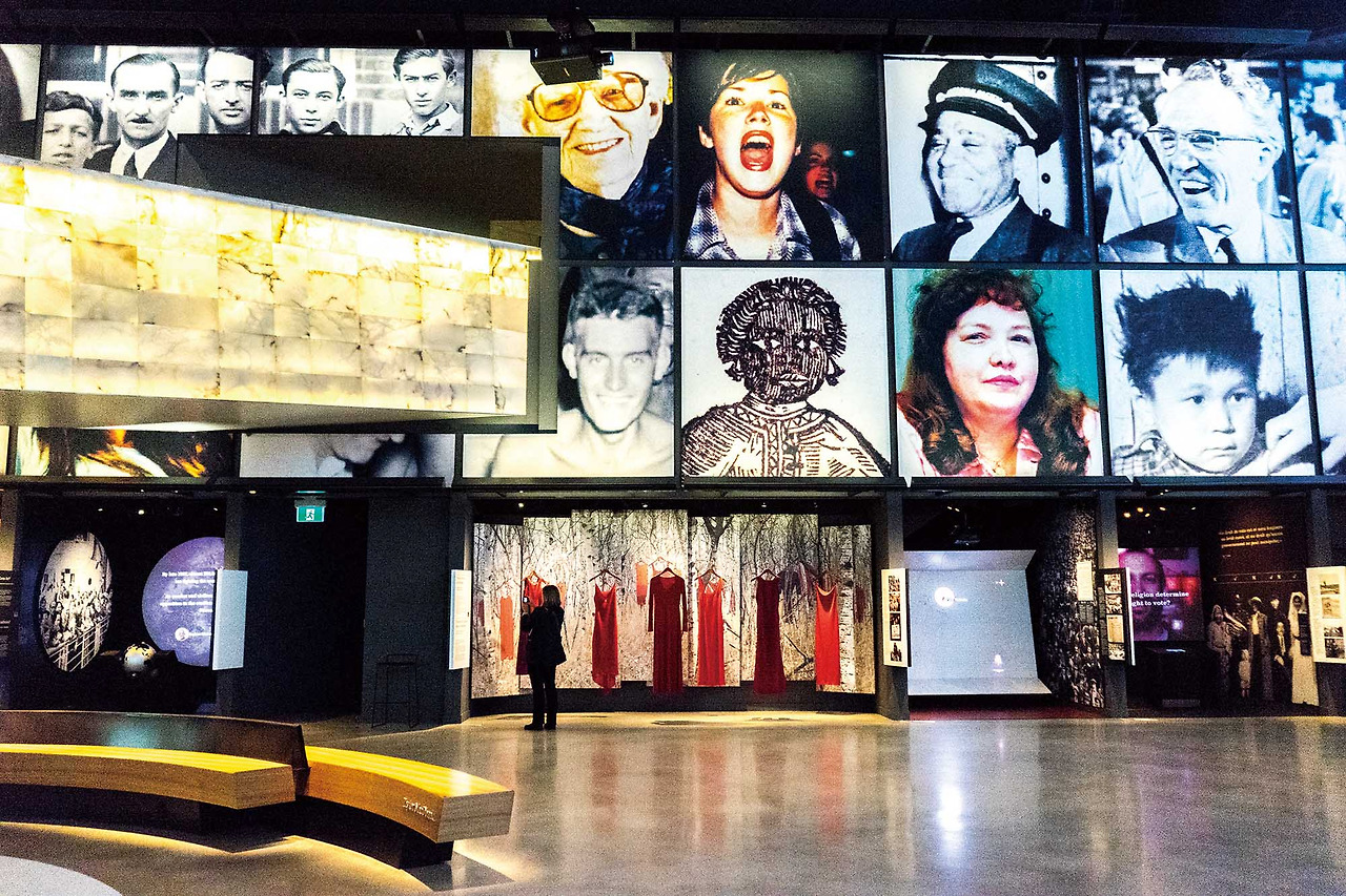 “1층부터 3층까지는 걸어서, 3층부터는 엘리베이터를 타고 올라가죠. 지금껏 보지 못했던 새로운 박물관 투어가 될 거예요.” 미디어 홍보를 담당하는 모린 피첸리(Maureen Fitzhenry)가 박물관을 안내하며 말한다. 어두컴컴한 내부로 들어서면 먼저 인테리어에 감탄사가 절로 터져 나온다. 박물관 설계를 맡은 미국 뉴멕시코 출신 건축가는 노출 콘크리트와 대리석, 철근과 벽돌을 보기 좋게 버무려놓았다. 7층까지 지그재그로 올라탄 대리석 통로는 거대한 설치 작품처럼 건물을 관통하며 방문객의 시선을 연신 잡아 끈다. 황금빛 조명을 매입한 대리석 통로를 따라 1층씩 걸어 올라가면 피첸리가 전언한 ‘어둠에서 빛으로 떠나는 여행’이 비로소 와 닿는다. 층마다 다른 주제를 선보이는 전시관은 과거 인종차별이 심하던 캐나다에서 인권 발전의 계기가 된 사건과 변천사를 단계별로 보여준다. 방문객은 전시물을 요리조리 살피거나 원형 테이블 앞에 모여 터치스크린 스크롤을 움직이며 캐나다의 최신 인권 법률을 살피기도 한다. 돔형 극장에서는 원주민 이누이트(Inuit) 문화를 보여주는 서라운드 영상이 쉴 새 없이 돌아가고 있다. 나이, 국적, 성별을 불문하고 인권에 대해 한마디씩 던진 인상적인 문구는 벽면을 꽉 채운 멀티스크린을 장식한다.
