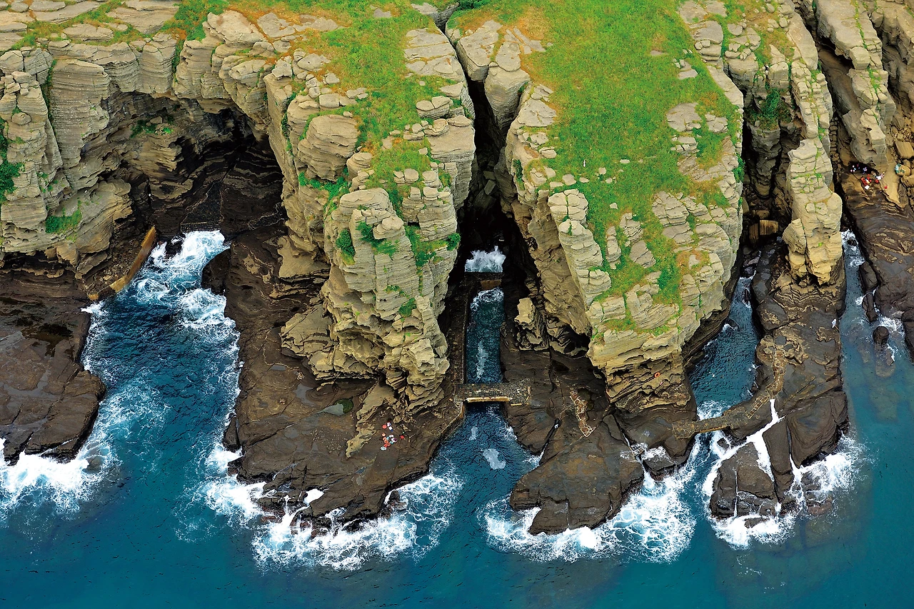 제주도 서귀포시 안덕면 용머리해안. 바닷속으로 들어가는 용의 머리를 닮았다 하여 붙은 이름이다. 멀리서 보면 평범한 듯하지만, 좁은 통로를 따라 내려가면 오랜 세월 층층이 쌓인 사암 절벽이 나온다. 180만 년 전 수중 폭발로 형성된 화산력 응회암층으로 수평 절리, 풍화혈, 해식동굴, 수직 절리단애 등의 지형이 어우러져 절경을 이룬다. 해산물을 파는 아주머니들이 군데군데 앉아 있어 경치를 즐기며 쉬어갈 수 있다.