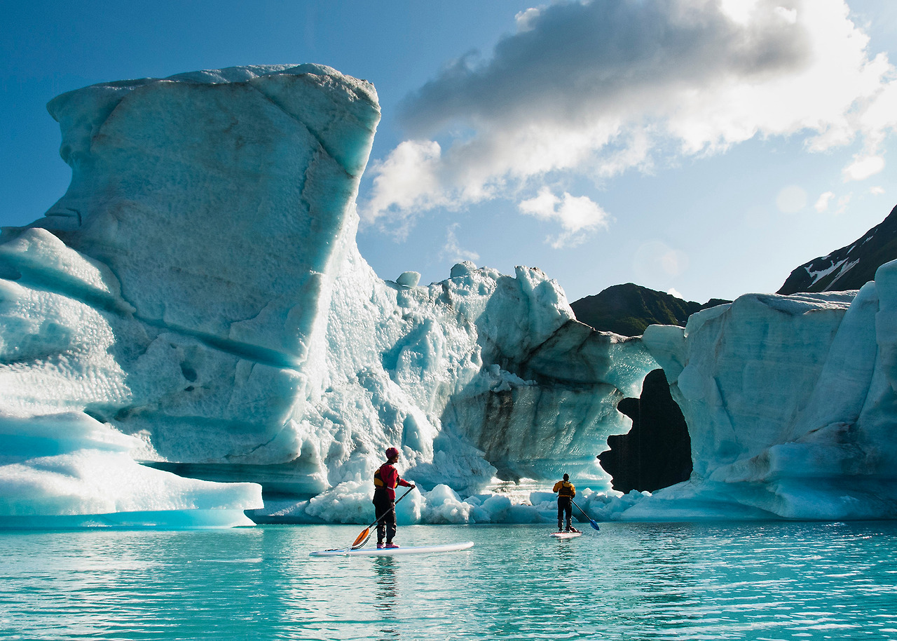 케나이 피오르 국립공원 베어호(Bear Lake)에서 스탠드업 패들보드를 타며 얼음 융해를 연구하고 있는 모습. © James and Courtney Forte / Aurora Open / Getty Images
