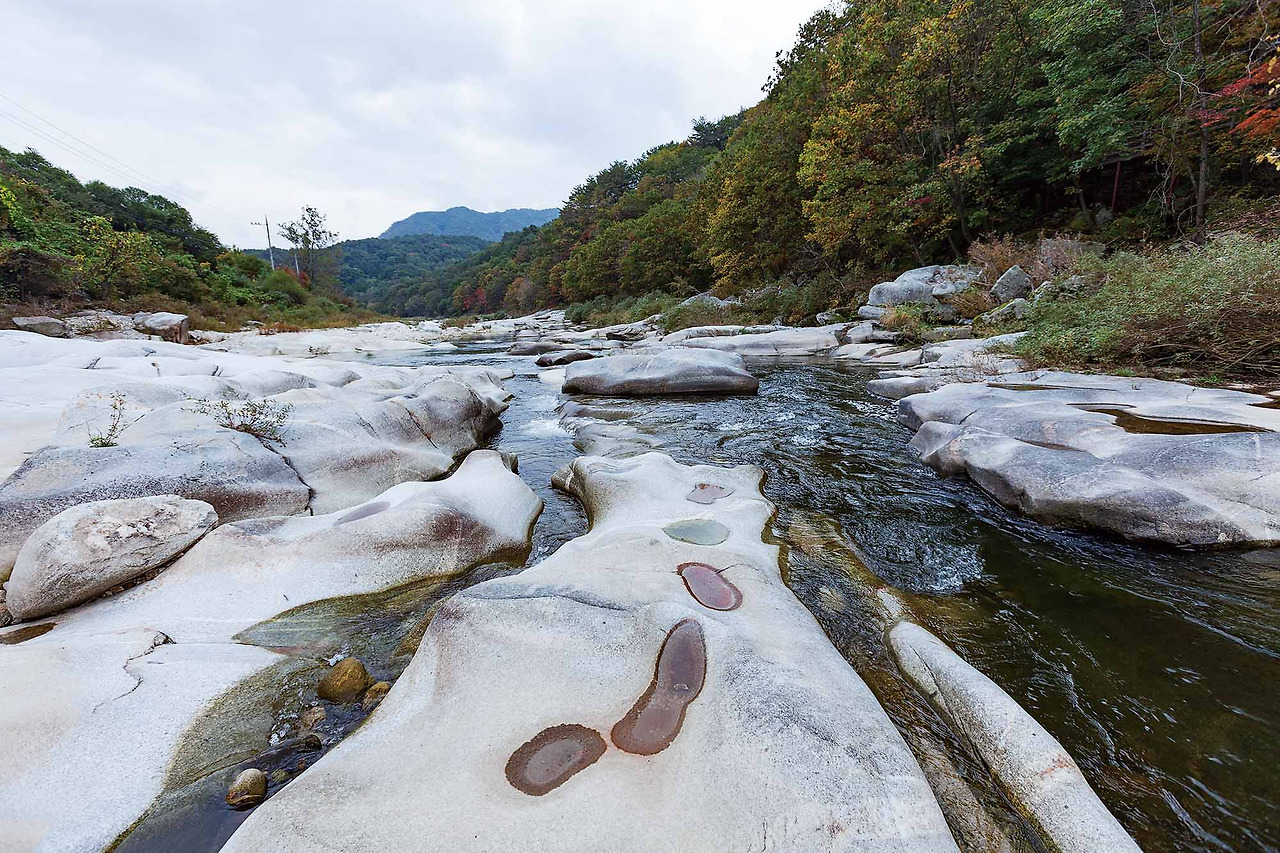 이른 아침 비수구미 생태길의 풍광은 다채롭다. 파로호의 지류에서 형성된 물안개가 아스라이 산야를 감싸고, 계곡 양쪽을 따라 우거진 활엽수의 단풍이 완연하게 맺혀 있다. 계곡의 물소리와 새와 곤충의 울음소리가 규칙적으로 교차한다. 시야를 방해하는 인공 조형물이라고는 길 초입의 이정표와 안내판이 전부다. “비수구미 생태길은 마음을 한결 놓이게 하네요. 어릴 적 도시 교외에서 흔하게 보던 원시림이 그대로 우거져 있으니까요.” 문경수 대장이 생태길을 경쾌하게 오르며 말한다. 그의 발걸음은 거침없어 보인다. 길 한복판에 깊게 파인 물웅덩이를 지나갈 때도, 미끌미끌한 이끼가 낀 바위로 가득한 계곡을 건널 때도 한 치의 망설임이 없다. “그간 여러 지형을 걸으며 지나갈 수 있는 길을 체득한 덕분이죠.”