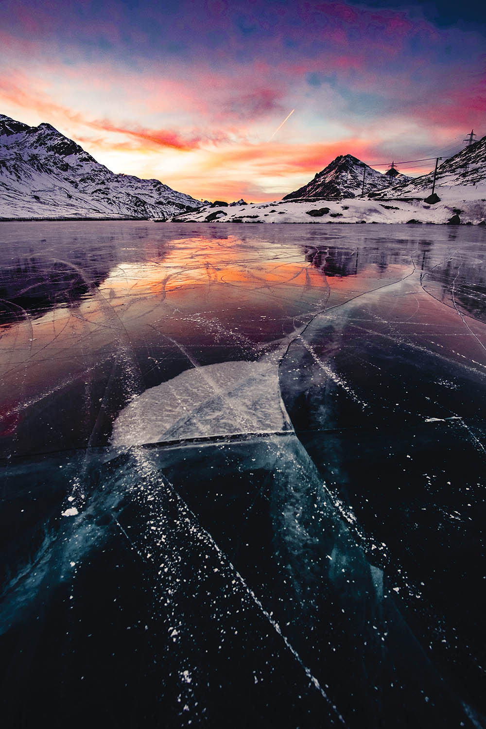알프스 최고의 풍경을 지나는 파노라마 기차 베르니나 익스프레스(Bernina Express)의 루트 중에는 겨울에만 만날 수 있는 특별한 풍경이 숨어 있다. 바로 오스피치오 베르니나(Ospizio Bernina)역 근처에 펼쳐진 라고 비앙코(Lago Bianco)의 검은 얼음. 햇살 가득한 겨울날, 검고 유리처럼 매끈한 표면의 얼어붙은 호수 위에서 마법 같은 순간을 맛보자. 해 질 녘에는 검은 호수 표면에 붉은 노을이 반사되어 핑크빛에서 깊은 붉은빛으로 변해가는 장관을 바라볼 수 있다.