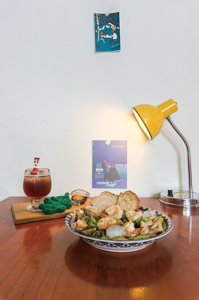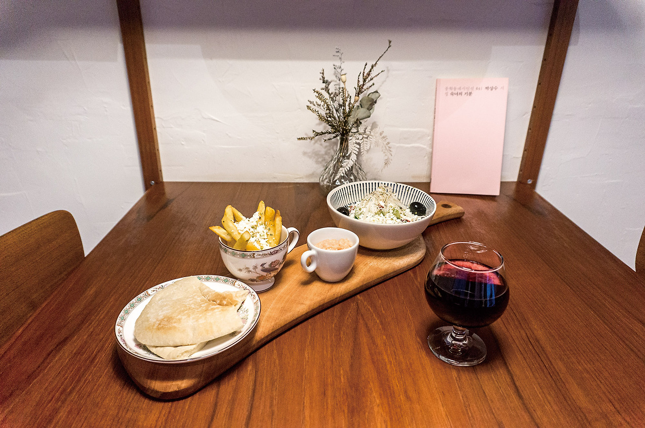 맞배집에서는 주문과 동시에 시집 1권을 건넨다. 정성스러운 코멘트가 달린 책을 느긋이 읽다 보면 어느새 그리스 음식이 테이블을 채운다. 여행 중 배운 요리를 통해 새로운 경험을 소개한다는 주인장은 그리스, 일본 등 여러 나라의 음식을 선보인다. 대표 메뉴는 ‘그리스 세트’. 그리스식 샐러드, 어란으로 만든 딥 소스, 감자튀김 등을 주머니처럼 생긴 전통 빵에 넣어 먹는 것으로 이국적인 향과 건강함이 물씬 느껴진다. 상그리아부터 애플 사이다, 하루키 소설 속 칵테일을 재현한 ‘산토리 하이볼’까지. 단출하지만 알찬 주류 리스트도 갖췄다. 다양한 모임과 공연, 전시 등의 행사도 주최하니 인스타그램을 주목할 것.