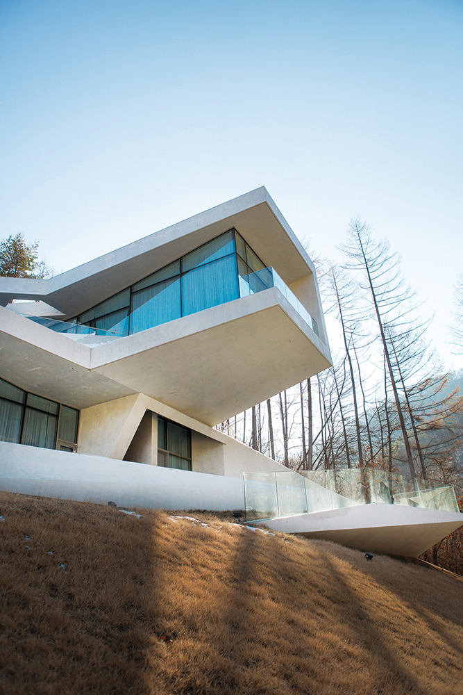 “완전히 새로운 형태의 휴양 공간을 만들고 싶었어요.” 의류업에 종사하던 서윤원 대표는 은퇴 뒤 머물 곳을 찾던 중 넉넉하게 산과 계곡이 감싼 홍천 대곡리의 둔덕을 발견했다. 출장과 여행을 통해 세계 곳곳에서 건축물을 살피며 심미안을 쌓은 그는 자신이 찾은 대자연 속에서 수준 높은 펜션을 운영하기로 결심했다. 장동건·고소영 부부의 가평 신천리 주택과 최근 기장에 오픈한 웨이브온 카페 등을 설계한 이뎀건축 곽희수 건축가의 강렬한 스타일은 서윤원 대표가 그리던 건축과 가까웠고, 그렇게 두 사람은 인연을 맺게 됐다.
