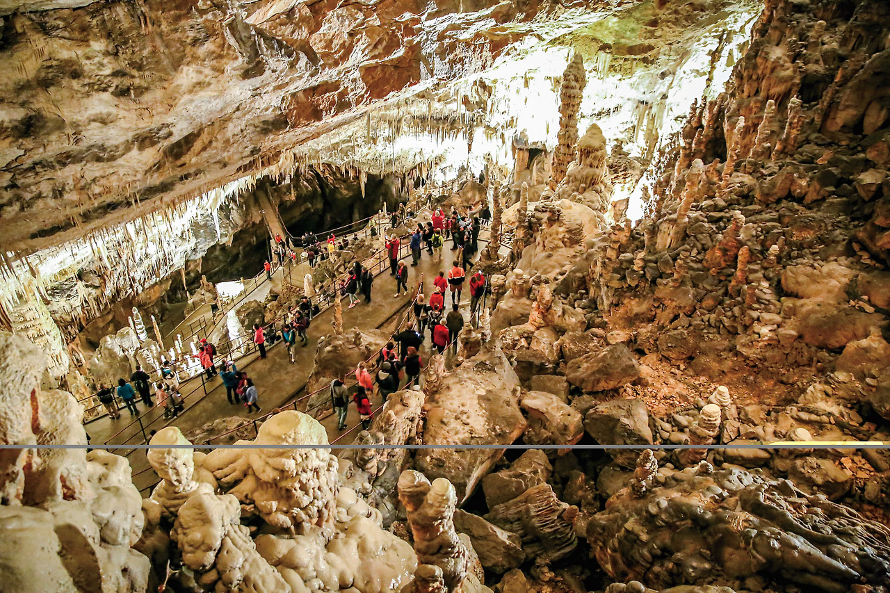 슬로베니아에는 약 1만 개가 넘는 석회동굴이 있는데, 단 15개만 일반인에게 공개한다. 그중에서도 1년 내내 개방하는 곳은 단 3곳뿐이다. 세계에서 두번째로 긴(길이 24km) 포스토이나 동굴(Postojnska Jama)은 유네스코 지정 세계자연문화유산으로 1년 내내 개방하는 곳 중 하나다. 이 동굴의 형성 시기를 정확히 기록한 문헌은 없지만, 가이드 마리오(Mario)는 자신의 할아버지가 동굴 열차 기관사로 일하던 기억을 더듬으며 동굴의 역사를 짚어간다. “이곳 주민이 동굴을 발견하고, 1818년 일반인에게 개방했어요. 동굴 탐험을 위한 꼬마 열차가 생긴 건 1872년입니다. 동굴 안에 전기 조명을 설치하고, 열차 궤도를 만드는 일부터 쉽지 않은 작업이었죠.” 오늘날 관광객에게 허용하는 구간은 단 5킬로미터. 동굴 열차를 타고 65미터 지하로 내려가면 도보로 돌아다닐 수 있는 약 3킬로미터의 길이 열린다. 약 1시간 30분 동안 주어진 시간에 동굴 전체의 약 5분의 1만 돌아볼 뿐이지만, 사실 이것도 쉬운 일은 아니다. 이른 아침부터 동굴 앞에 길게 늘어선 줄을 기다려야 하고, 지하의 차가운 공기를 견디기 위해 두툼한 점퍼도 필요하다. 무릎을 최대한 굽혀 아담한 열차에 오르면 뚝뚝 떨어지는 물을 맞거나, 낮은 천장을 지날 땐 고개를 연달아 숙여야 한다.