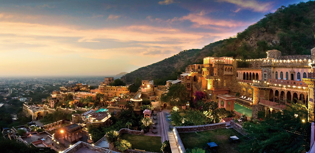 어떤 성인가? 마치 신기루처럼 보이지만, 볼을 꼬집어볼 필요는 없다. 라자스탄 끝자락의 외딴 평원, 고대 도시 님라나의 왕실 가족이 거주하던 15세기 요새와 성을 복원한 호텔이다. 부지는 무려 2만여 제곱미터. 언덕의 경사면을 따라 7채의 고성과 공중 정원, 야외 원형극장까지 펼쳐진다.