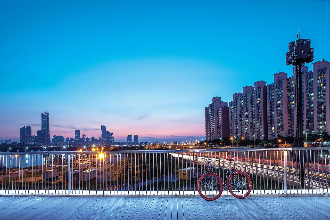 해는 하루의 마지막 빛을 내뿜고, 한강은 붉은 비늘을 단 듯 번쩍이고, 저 멀리 남산타워와 빌딩 숲은 검은 그림자로 잠긴다. 황홀한 광경을 보는 일행의 속마음은 살짝 지쳐간다. 노들섬 너머 여의도에 지는 해를 보기 위해 겁도 없이 퇴근 시간에 한강을 건너 이촌 한강공원으로 가는 일정을 짠 탓이다. 휴일이라면 괜찮았겠지만. 아슬아슬하게 석양 시간에 맞춰 도착했다. 자욱한 안개에 휩싸인 63빌딩과 여의도 풍경이 낭만적이지만, 기대하던 화려한 석양의 모습과는 좀 다르다.