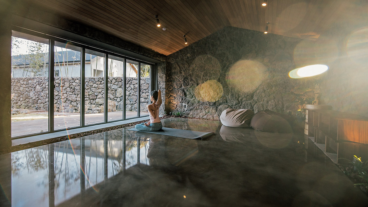 보안 스테이 41호에서 바라보이는 차분한 정경은 단아한 객실과 조화를 이룬다. 매년 특정한 테마에 맞춰 책을 선별하는 보안책방. 바닥은 옛 추사 김정희 집 터의 흔적을 볼 수 있도록 유리로 설계했다. ⓒ 임학현