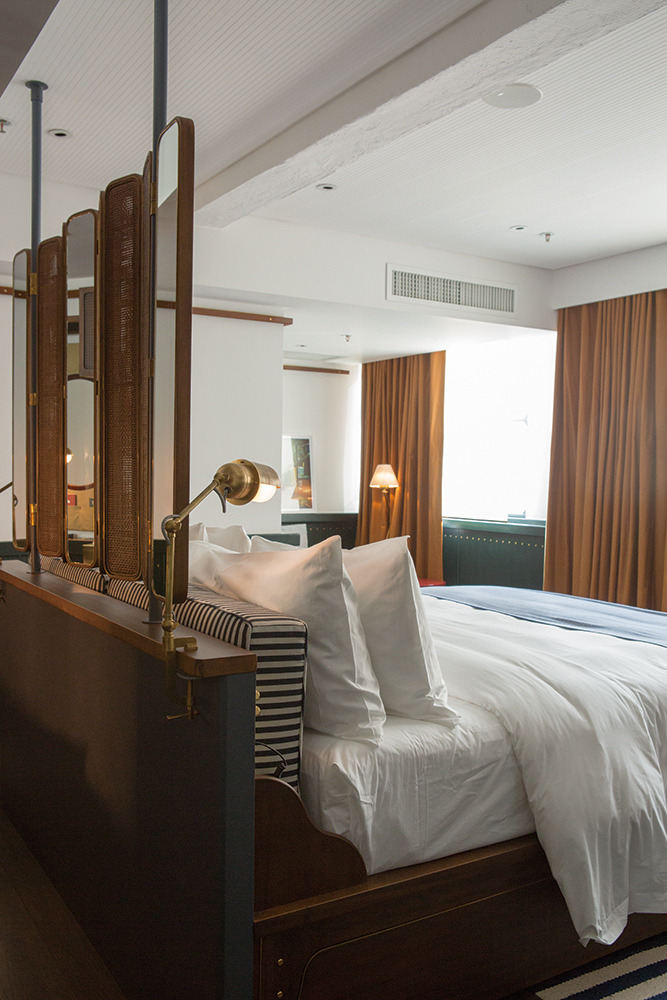 호텔 곳곳에 쓰인 황동 소재와 스트라이프 패턴, 객실과 엘리베이터의 곡선형 문, 객실에 걸린 소지품 보관용 주머니와 원형 거울에서 배를 떠올린다면 정확히 맞힌 것이다. 더 플레밍의 모티프는 선박업과 제조업이 번영기를 맞은 1960~1970년대 홍콩, 특히 홍콩의 명물인 스타 페리다. 위트 있는 디자인은 물론이고, 침대 머리맡에 마련한 독서등과 USB 포트 등 투숙객에 대한 배려가 객실 구석구석에 숨어 있다. 기능과 디자인의 조화는 종종 짜릿한 순간을 선사한다. 가령 객실 문 안쪽의 황동 나사를 돌리자 문 바깥의 ‘THE FLEMING’ 사인이 ‘Do not Disturb’ 사인으로 변할 때나, 버튼을 누르자 스마트폰에 저장된 음악이 방 안 전체에 울려 퍼질 때처럼.