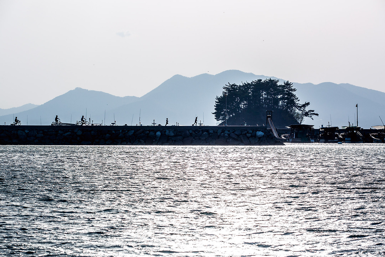 벚나무가 늘어선 마을 해안가에서는 작은 섬 소초도와 대초도 그리고 사천 땅의 실루엣까지, 무수한 푸른빛으로 풍경이 그림처럼 완성된다. 선거 캠프 조끼를 입은 남자가 휑한 해안 도로에서 유세 활동을 하고, 바지락을 캔 아낙네는 옆구리에 바구니를 끼고 집으로 향한다. 사내아이들은 바닷바람을 맞으며 자전거를 타다가 해변에 내려가 왁자지껄 조개를 줍다가, 이방인의 카메라에 호기심을 보인다. 유독 활달해 보이는 아이에게 중현떡집에서 싸준 쑥떡 1팩을 건넨다. 입맛에 맞을까 하는 걱정이 무색하게 아이는 “얘들아, 쑥떡이다!” 하고 신나게 외친다.