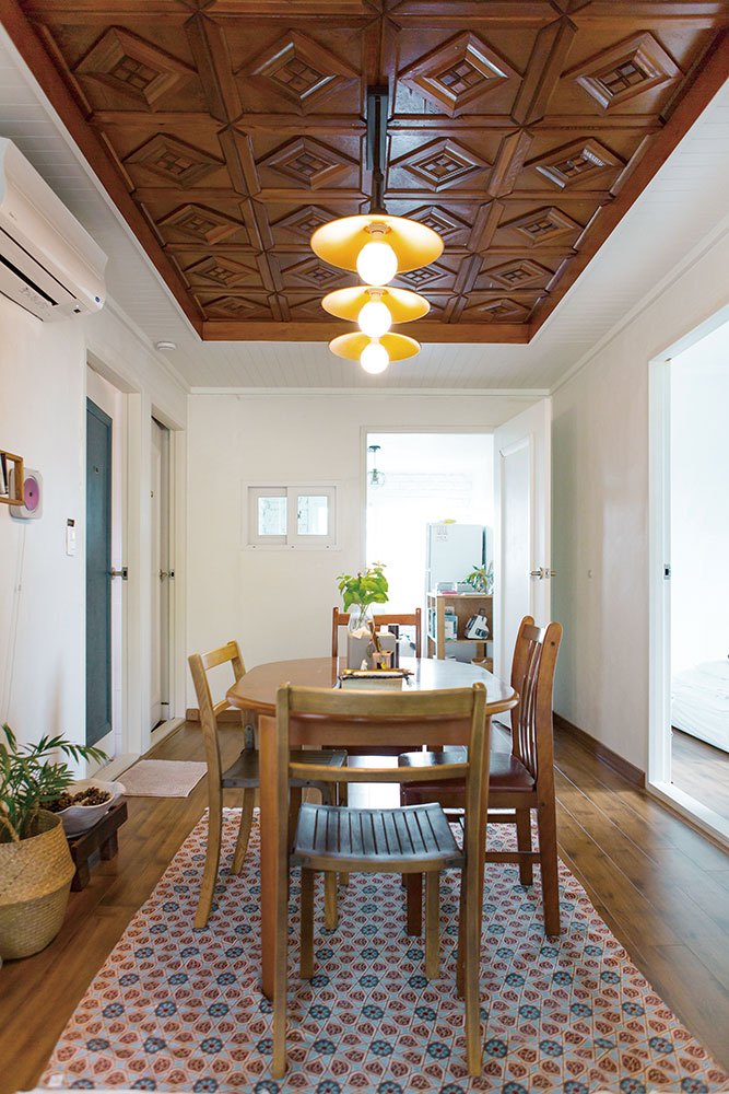 해변에서 금능마을 안쪽으로 들어서면 안온한 분위기를 이어갈 만한 숙소가 기다린다. 40년 전 마을 교감 선생님의 사택으로 지었던 단층 가옥을 정갈하게 개조한 ‘추의 작은집’. 새하얀 외벽에 ‘House + Barn’이라 쓰인 문구처럼 3개의 1인실과 거실, 부엌이 딸린 본채와 옛 창고를 2인실로 꾸민 별채가 나뉘어 있다. 제주 전통 가옥의 대문 역할을 하는 정낭도 그대로 살려놓았다. 기다란 정낭 나무 2개가 땅에 내려져 있다면 투숙객을 환영한다는 의미. 목련나무와 야자수가 오묘하게 어우러진 안뜰 너머로 강아지 오구가 고개를 내밀고, 본관에선 어쿠스틱 뮤지션 이영훈의 ‘멀리 있는 그대에게’가 잔잔하게 흐른다. “이곳은 주로 ‘혼행족’이 찾는 편이에요. 여럿이오더라도 1인실에 각자 머물며 사적인 시간을 보내곤 하죠. 저 역시 친구와 제주 여행을 할 때 각자 1인실에 머문 적이 있어요. 고즈넉한 마을 분위기를 오롯이 느끼던 그때의 짧은 휴식이 인상적이었어요.” 두 달 전 제주로 건너와 직원으로 합류한 이민영 씨가 추의 작은집에서의 소소한 기억을 들려준다.