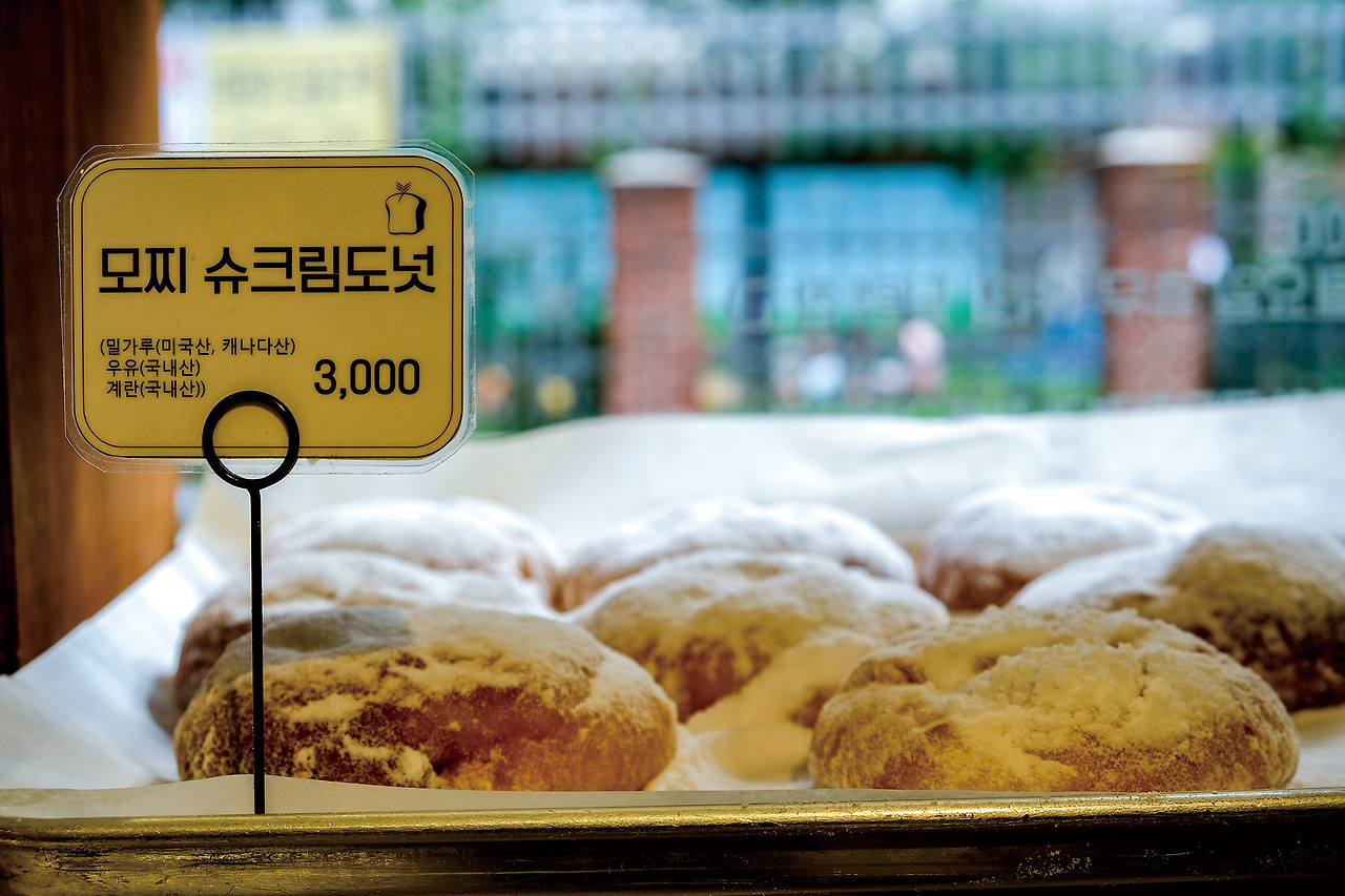 고급 베이커리가 즐비한 옥수동에서도 가장 인기 있는 빵집. 작년 여름 최수민 셰프가 오픈했는데, 빵이 나오기무섭게 진열대가 텅 비어버리기 일쑤다. 우리 입맛에 익숙한 부드러운 탕종빵을 주로 만들며, 반죽에 찹쌀을 넣어 쫀득쫀득한 식감을 낸다. 익반죽을 50퍼센트 정도 사용하는 이곳의 탕종빵은 수분이 많아 부드럽고 글루텐 성분이 적어 소화가 잘되는 것이 특징. 모찌 부추 도넛, 쿨 모찌 마스카르포네, 모찌 크림 소보로 등 25종의 빵 중 하이라이트는 역시 달걀과 우유, 분유를 넣지 않아 담백하고 쫄깃한 모찌 식빵이다.