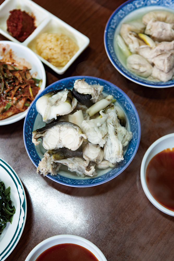 “이 프레임이 참 마음에 드네요. 저는 긴 시간을 버텨낸 장소나 사람을 보면 항상 존경심이 들곤 해요.” 홀로 정성스럽게 복국을 끓이고, 찬거리를 준비하는 모습을 응시하던 김종관 감독이 말한다. 40년간 한자리를 지킨 주방의 세간은 놀랍도록 정갈하다. 사실 그의 영화에서 주인공이 음식을 먹는 장면은 거의 등장하지 않는다. 거리를 걷고 잠시 카페에 들러 차를 마시고 대화를 나누는 장면으로 신을 연결하는 식이다. 이는 감독의 여행 패턴과도 꽤 닮았다. “여행 중 먹는 일에 크게 비중을 두지 않아요. 이런 오랜 손길이 닿은 식당을 만날 때를 제외하면요.” 여든이 넘었다는 주인장은 자갈치시장에서 떼온 밀복을 손질해 국을 끓이는데, 이른 시간에 찾으면 푹 삶은 복어 알과 뱃살도 서비스로 내준다. 살이 튼실한 복어 수육을 맛본 뒤에는 김이 모락모락 나는 복국이 식탁의 빈 자리를 비집고 들어온다. 조미료를 일절 첨가하지 않은 복어 자체의 순수한 맛이라고 해야 할까? 생경하면서도 기분 좋은 복국의 향과 맛에 이끌려 어느 순간 한 그릇을 뚝딱 비워낸다. 김종관 감독은 속삭이듯 말한다. “딱 이 집 주방과 닮은 맛이네요.”