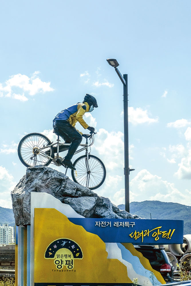 동트기 전 양평으로 차를 몬다. 바깥공기가 제법 쌀쌀하다. 한없이 더울 것 같던 여름도 떠났다. 계절은 거짓말을 하지 않는다. 두물머리 입구에 닿으니 갑자기 차가 막힌다. 주말인 데다 가을이다. 출발할 때는 50분 정도 걸린다더니. 여러 번 말을 바꾼 내비게이션은 2시간이 지나서야 목적지인 양수역 주차장에 데려다준다. 차에서 내리자마자 자전거 라이더가 여럿 보인다. 아이언맨 슈트처럼 몸에 꼭 맞는 운동복과 헬멧을 갖춰 입은 모습이 멋지다. 삼삼오오 팀을 이뤄 저마다의 길을 향해 분주히 페달을 밟는다. 이들을 따라 자전거 탈 생각에 벌써 설렌다. 사실 양평 초입부터 설렘은 시작됐다. 꽉 막힌 도로 위, 자전거 레저 특구 달려라 양평!이라는 문구와 자전거를 타고 질주하는 사람의 조형물을 봤을 때 ‘저거다!’ 싶었다. 그때부터 마음속 풍선에 바람이 들기 시작했다.