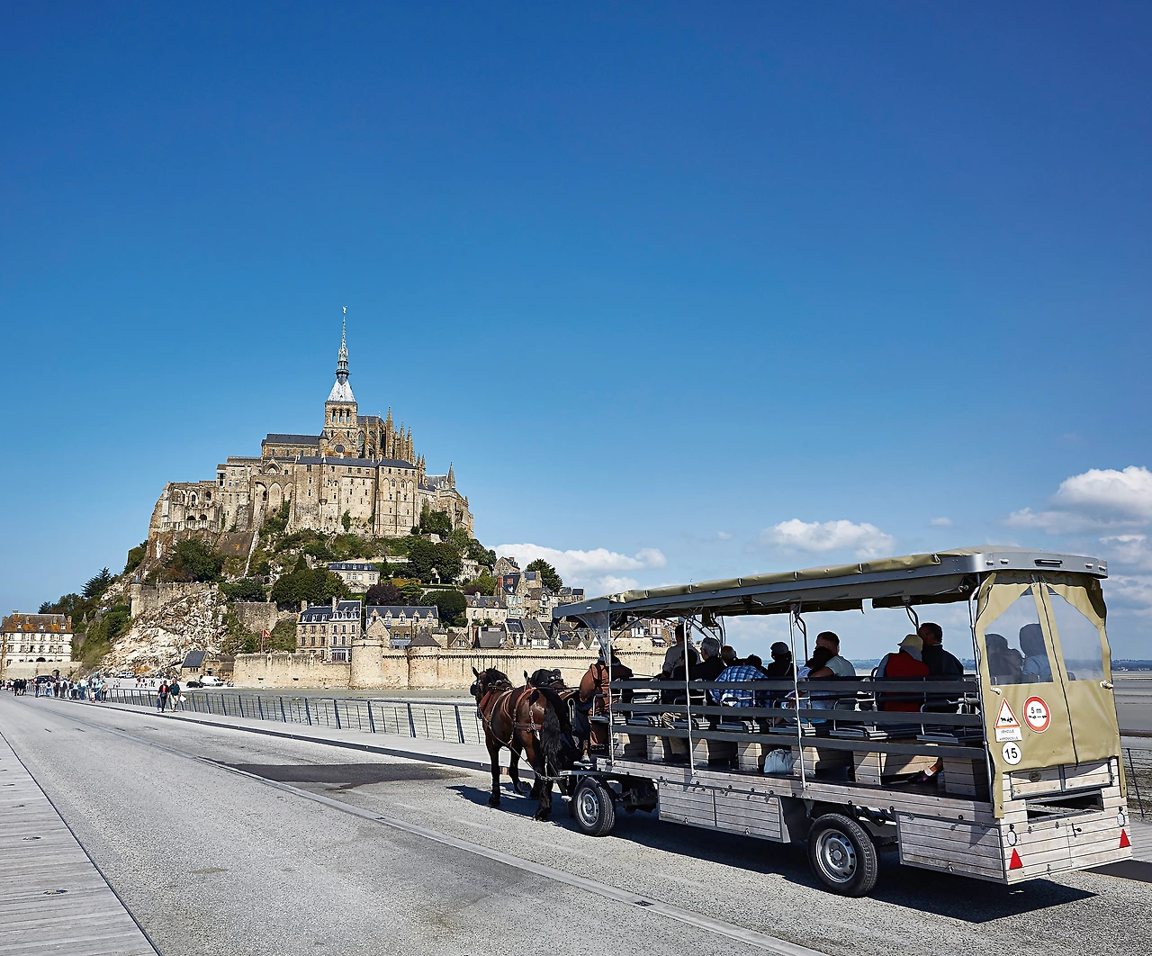 입구를 통과하면, 교회까지 오르막 자갈 길이 이어진다. 그 짧은 구간에 기념품 상점과 레스토랑, 카페, 숙소가 오밀조밀 붙어 있어 사람들로 번잡하다. 공식적으로 이곳에 적을 둔 주민은 50여 명이나, 연간 방문객은 100만 명이 넘는다. 노르만 양식, 로마네스크 양식, 고딕 양식이 뒤죽박죽 조화를 이룬 수도원과 교회 건물은 천 년이 넘는 역사를 대변한다. 처음 수도원이 생긴 후 종교 건물이 계속 추가되었고, 순례자를 위한 부대시설도 추가됐다. 브르타뉴(Bretagne)와 노르망디의 경계를 이루는 지정학적 위치로 인해 방어 요새 역할도 필요했다. 프랑스대혁명 후에는 감옥으로 사용했기 때문에 관련 시설을 또 덧붙였다. 그래도 고딕 양식의 걸작인 메인 건물 라메르베유(La Merveille)의 숭고함은 그대로다. 3층으로 이루어진 이 건물 위층의 교회와 수도원에서 수사들은 고립된 삶을 살았고 수도원장과 상위 성직자들은 중간층에서 귀빈을 맞았다. 순례자들은 지하층만 입장할 수 있었다. 그중 가장 성스러운 분위기가 감도는 공간은 13세기에 지은 아치 회랑(Cloître). 사각형의 정원을 고딕 양식 기둥이 이중으로 둘러싸고, 사방의 아치 회랑으로 몇 움큼의 빛이 통과한다. 바다를 향한 한쪽 벽으로는 영원히 미완성으로 남을 듯한 아치형 출입구가 뚫려 있다. 출입구 너머로 바닷물이 빠져나간 짙은 회색의 갯벌이 보인다. 썰물 때에는 몽생미셸 주변 1킬로미터까지 산책할 수 있다. 수세기 전의 순례자는 모두 그와 같이 걸어왔다. 미쳐 빠져나가지 못한 바닷물의 웅덩이는 점점이 흩어져 후기 인상파의 점묘화처럼 윤슬이 반짝인다. 물 위에 떠 있는 수도원의 모습만큼 이 안에서 내려다보는 노르망디의 풍경은 아름답다.
