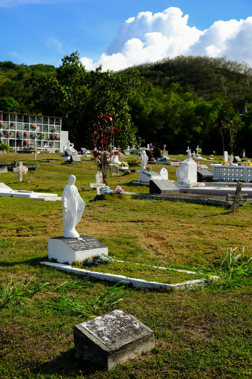 묘지를 촬영한다는 것을 불경하게 여길 사람도 있겠지만, 카메라를 내려놓고라도 괌의 공동묘지는 한번쯤 들러볼 만하다. 가톨릭 신앙과 열대지방의 미감이 섞인 독자적 형식을 갖고 있기 때문이다. 생동하는 초록과 대비되는 새하얀 조형물, 형형색색의 꽃으로 만든 화환과 바람개비. 피고 가톨릭 묘지(Pigo Catholic Cemetery)는 아델럽 포인트(Adelupe Point) 인근에 자리한 공동묘지다. 타무닝 시내에서 가까우며, 무엇보다 예수와 12사도의 거대 동상으로 구성한 그리스 양식의 파사드가 장관이다.