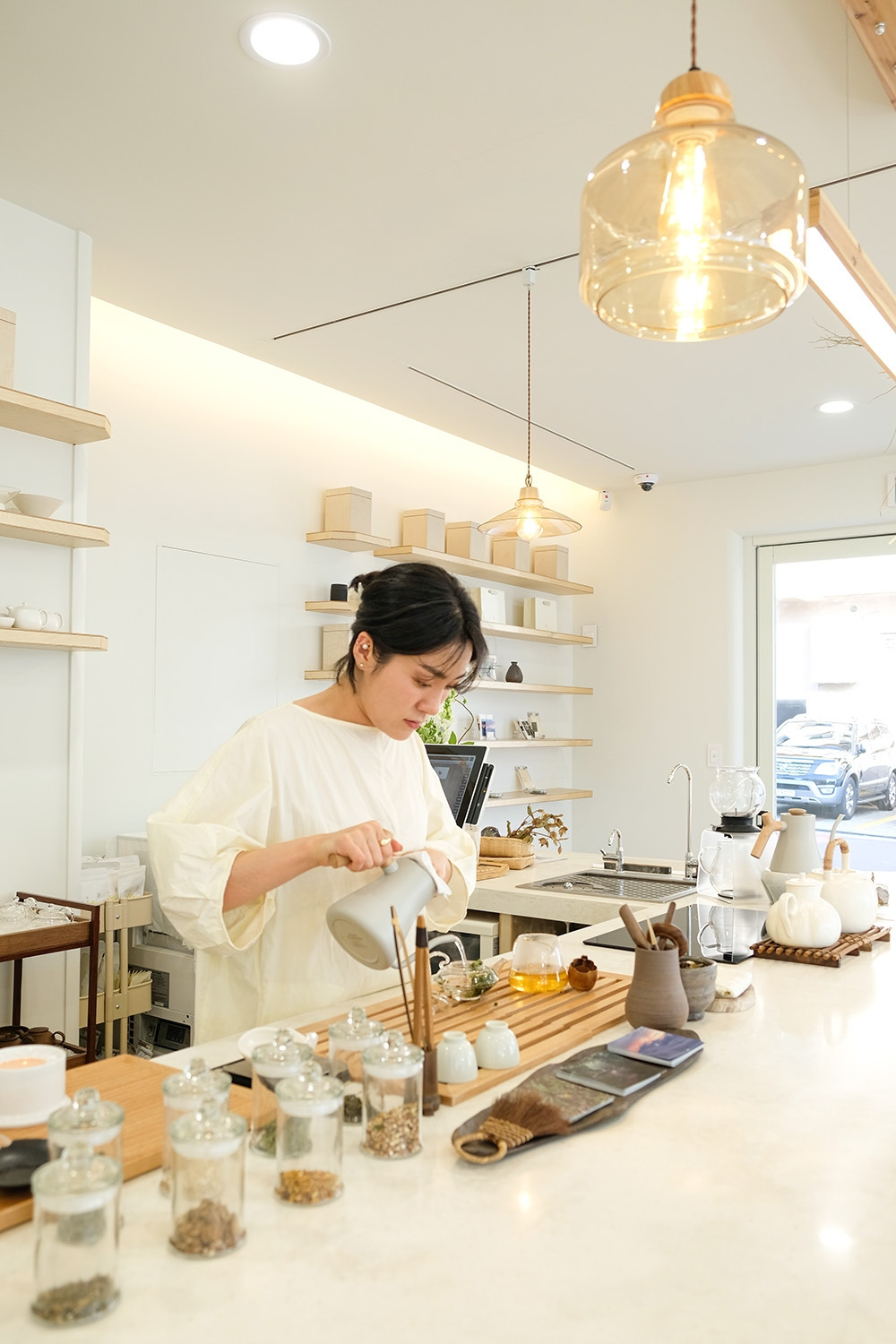 “제다(製茶)를 배우며 손끝에 느껴지는 열과 차의 향미가 변화하는 과정이 정말 매력적이었죠.” 송주연 대표는 몇 년 전 건강 때문에 차를 마시게 된 걸 계기로 제다를 익히고 오온을 열었다. 이곳에서 그녀는 직접 제주 자연에서 영감을 받아 블렌딩한 차를 선보인다. 제주에서 채취한 재료를 가미하거나, 효능을 고려해 조합한 ‘오온대용차’가 그것. 직접 찻잎을 덖거나 특별한 숙성 과정을 거친 호지차나 녹차 또한 향긋함이 남다르다. 차 입문자를 위해 특색 있는 차 음료도 준비했는데, 제주 차광 녹차나 쑥차 등에 우유를 더한 ‘오운차’가 대표적. 공간에 여백을 두고 국내 신진 작가의 가구나 다구를 전시한 것 또한 차를 일상에서 가까이 즐기도록 하기 위해서다.