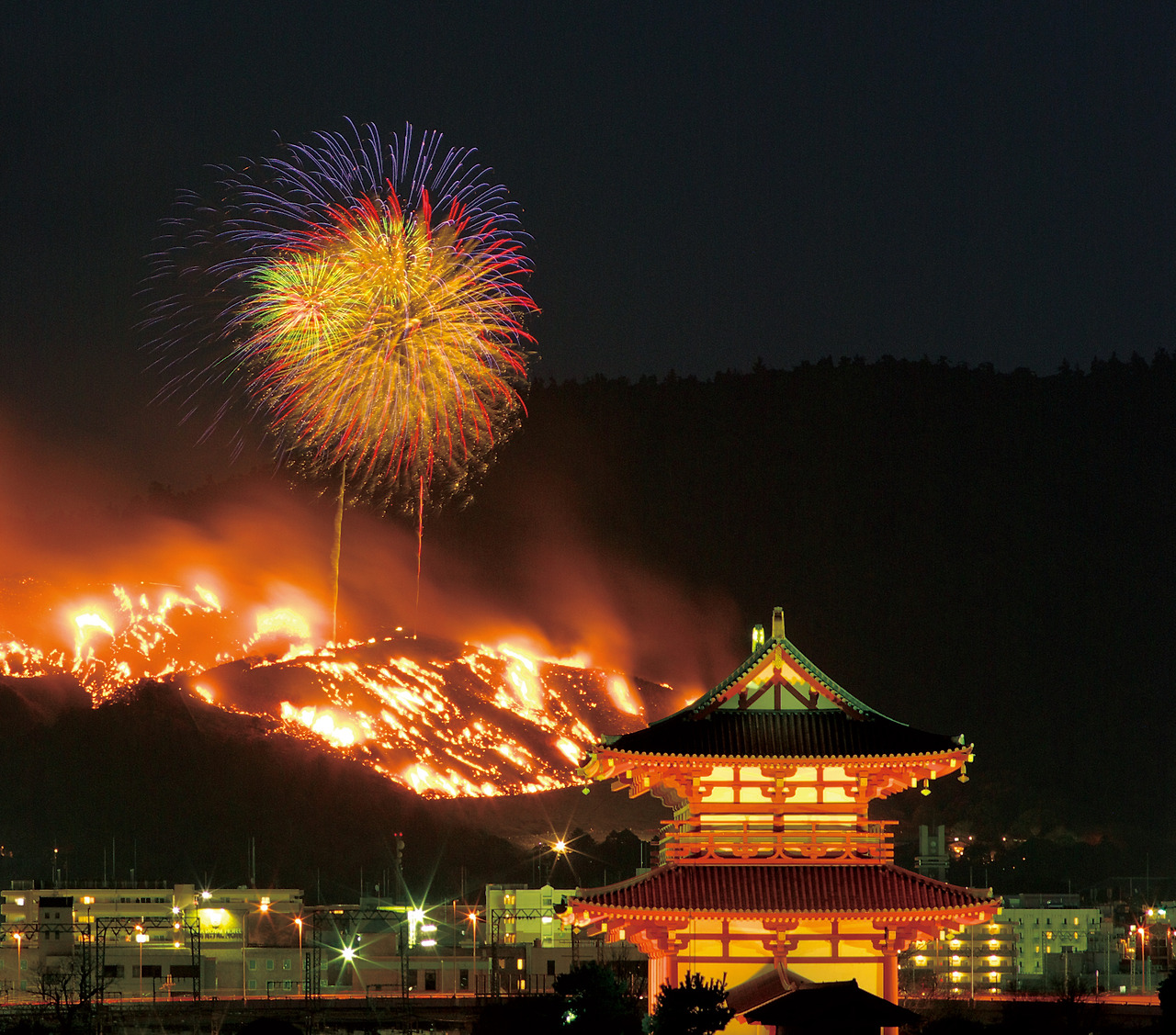 해 질 녘, 300명의 사람이 횃불을 들고 산자락을 따라 올라간다. 한 신사에 다다른 그들은 경건하게 제례 의식을 올리고 산등성이 곳곳으로 흩어진다. 산 아래에서 펼치는 화려한 불꽃놀이가 끝나면 일제히 횃불을 산에 놓아 불을 지핀다. 그렇게 산기슭에서 시작된 불길은 30분 만에 산 전체를 홀랑 태운다. 이는 매년 1월 넷째 주 토요일에 나라에서 열리는 봄맞이 축제 와카쿠사야마야키 풍경이다. 나라 공원 동쪽 너머 와카쿠사 산에서 13세기 때부터 이어져온 이 대규모 산불 축제는 묵은 풀을 태우고 다가올 봄을 준비하며 새해의 평안을 기원하는 의식. 공원 내에 있는 웅장한 목조 사원 도다이지 너머로 활활 타오르는 불길을 바라보고 있노라면 호기롭게 새해의 다짐을 읊조리게 될 것이다. 산불 구경에 앞서 나라공원에서 열리는 흥겨운 공연을 즐기고, 공원에 자유롭게 활보하는 1,200마리의 사슴에게 간식을 주며 평화로운 오후를 만끽해보자.