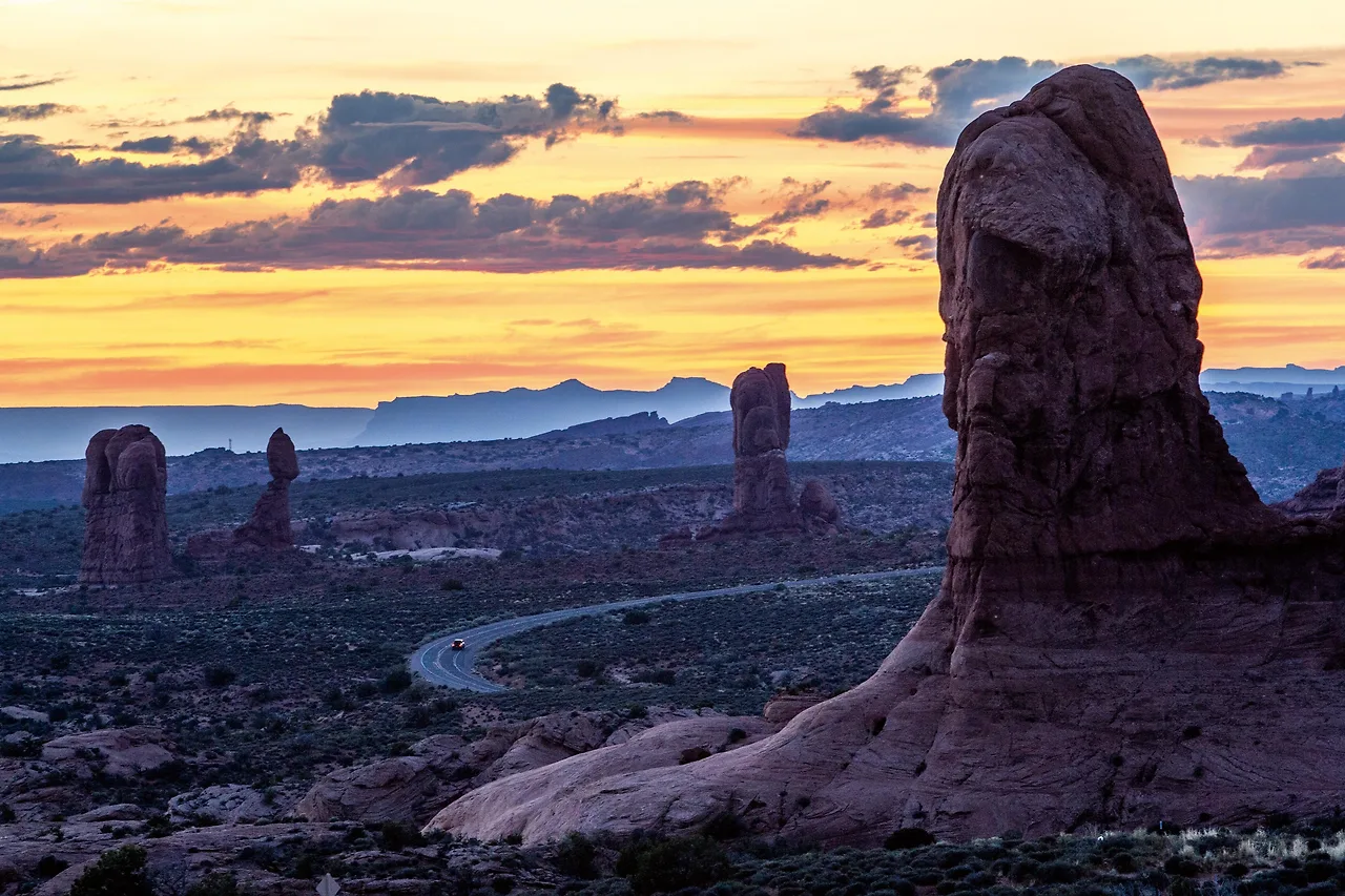 늦은 오후에 찾은 아치스는 공상과학영화의 배경을 준비하는 듯하다. 아치스 시닉 드라이브(Arches Scenic Drive)를 따라 달리는 내내 시선을 한 방향에 두기가 어렵다. 그만큼 예상하지 못한 장면이 사방에서 튀어나온다. 하염없이 파란 하늘에 찍힌 흰 점 같은 달, 외계 생명체처럼 여기저기에서 웅크리고 있는 사암 덩어리들. 사암이 내뿜은 붉은빛 너머로 짙은 청록색을 뒤집어쓴 라 살 산맥(La Sal Mountains)이 대비된다. 도대체 이 초현실적인 풍경의 끝은 어디일까? 아치스는 쉽게 답해주지 않을 것이다. 당장 노스 윈도(North Window) 아치에 도착하자 석양이 내려앉고, 연달아 서 있는 2개의 아치는 커다란 눈동자로 변해버린다. 어둠 속에서도 그들의 실루엣은 또렷하다. 달빛을 받아 또 다른 아치스의 세상이 열릴 기세다. 그리하여 밤. 저 멀리 공원 깊은 곳으로 들어가는 자동차의 헤드라이트가 사라져간다.