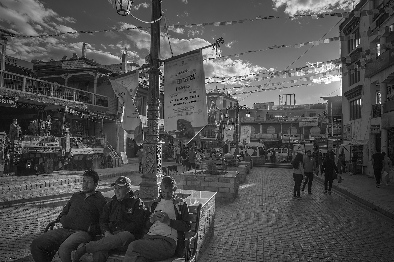 그 너머, 길게 뻗은 중심 도로가 바로 활기찬 메인 바자르(Main Bazaar)다. 차량은 다니지 않는 이 넓은 보행자 도로 위로 오색찬란한 타르초(Tarcho) 깃발이 역광으로 나부끼고 있다. 메인 바자르 가운데에는 벤치들이 있어, 한낮의 뜨거움을 피해 해가 기우는 시간에 많은 사람이 앉아 담소를 나누는 평화로운 일상이 펼쳐진다. 이곳은 관광객과 현지인, 특히 티베트 계열의 사람들이 "줄레 줄레(Juley)"를 외치며 활발하게 교류하는 레의 심장부다.