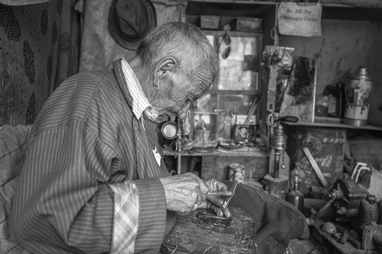 처음 할아버지는 카메라에 별다른 응답을 하지 않으셨다. 그런데 문득, 할아버지께서 손가락으로 벽 한쪽을 가리키셨다. 그곳을 보니 낡은 종이에 "Rs. 20/- For Photography Charges" 라고 쓰여 있었다. 나는 할아버지의 반응이 없음에 그저 작업에 집중하시는 줄로만 알고 계속 셔터를 누르고 있었던 것이다.
