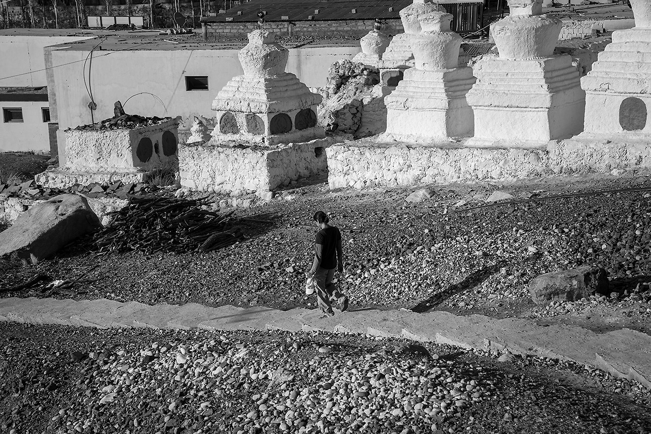 멀리 보이는 곰파는 언덕 위에 위치해 있어 오르는 길이 가팔랐다. 버스 여정의 피로가 몰려왔지만, 클라우디아와 함께 지름길로 오르는 작은 길은 매우 흥미로웠다. 그러나 오후 늦게 도착한 곰파는 이미 굳게 문을 닫은 뒤였다. 눈앞에서 환상적인 풍경과 명상의 시간이 좌절된 순간, 아쉬움이 밀려왔다.