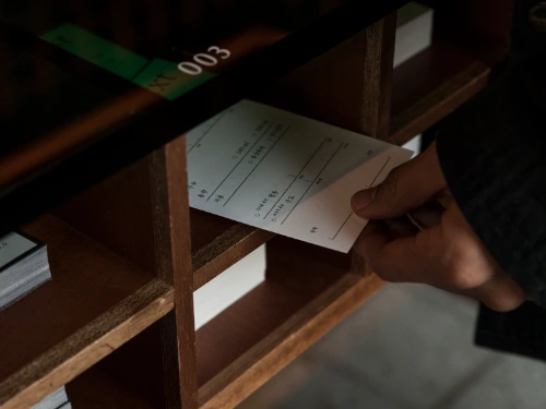 우편함 같은 나무 서랍장에 놓인 메뉴 주문서가 보여요.