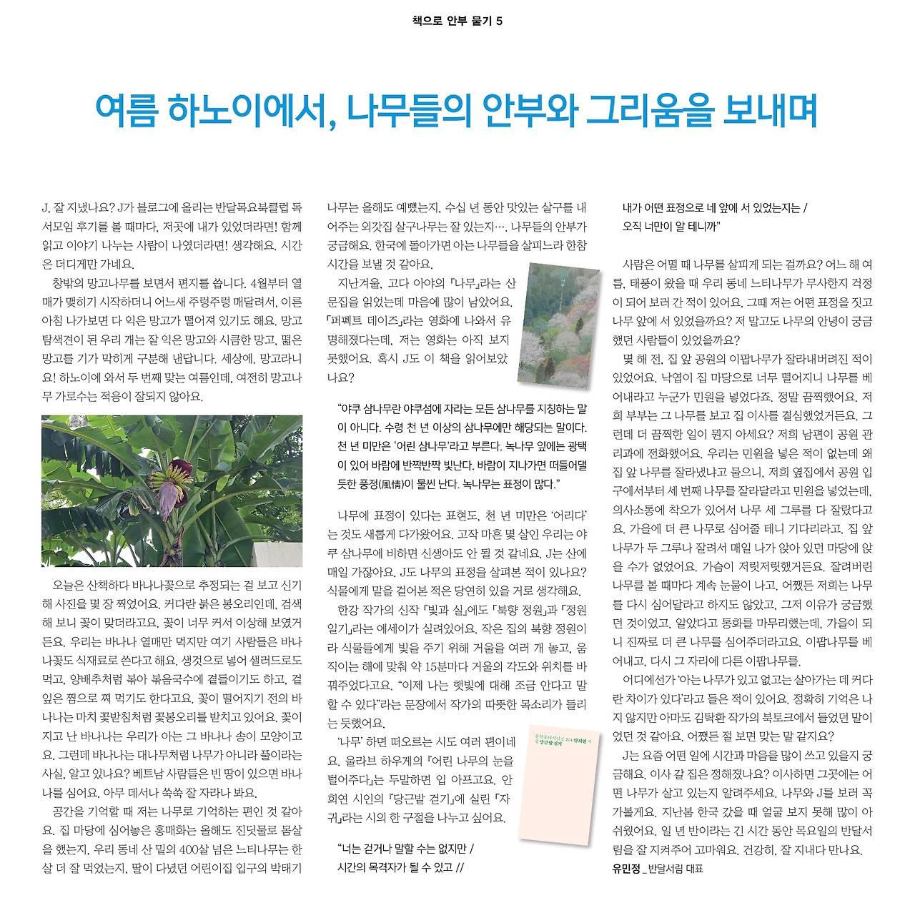 아직도 그 사실이 믿기지 않던 찰나, 민정 님에게서 한 통의 편지를 받았다. '사단법인 행복한 아침독서'가 매달 펴내는 《동네 책방 동네 도서관》의 ‘책으로 안부 묻기’ 코너에, 민정 님이 청탁을 받아 J(나, 효진이라구요!)에게 쓴 편지였다. 자연을 아끼고, 책을 좋아하는 민정 님의 모습이 그대로 담겨 있는 고운 편지를 받았기에, 나도 성급하게 답장을 써 본다.