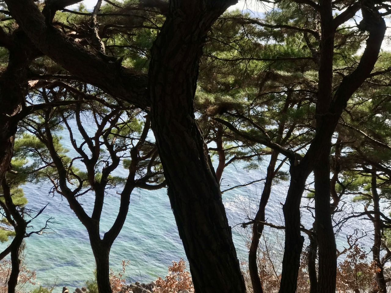 해변을 따라 걷다가 숲으로 이어지는 산책길을 발견했다. 소나무 사이로 바다가 보이다니, 최고의 산책길.