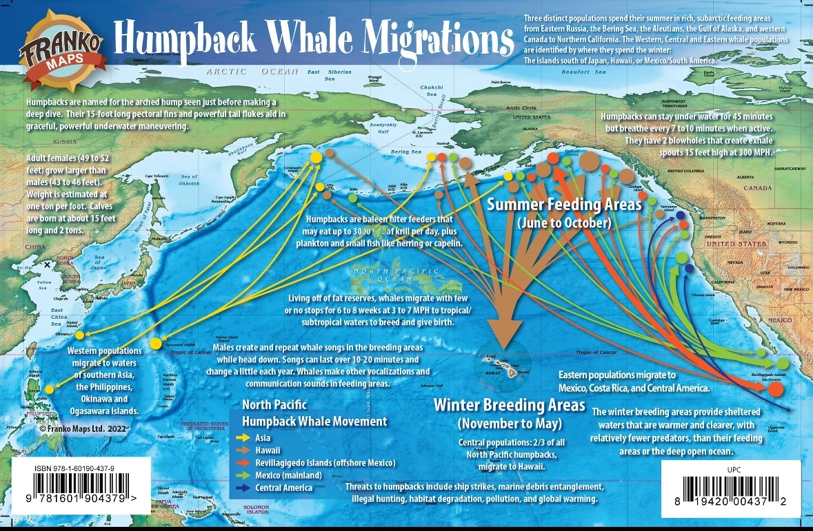 그러나 겨울이 되면 그들은 따뜻한 열대나 아열대 해역으로 이동한다. 하와이, 멕시코, 오키나와, 통가 같은 바다에서 혹등고래는 짝을 찾고 새끼를 낳는다. 그곳은 먹이가 거의 없는 바다다. 대신 수온이 높고, 새끼 고래가 체온을 유지하기에 유리하며, 극지방에 비해 포식자 압력이 상대적으로 낮다. 막 태어난 새끼는 차가운 물에서 오래 버티기 어렵다. 결국 혹등고래는 풍요로운 곳에서 먹고, 안전한 곳에서 번식하기로 선택한 셈이다.