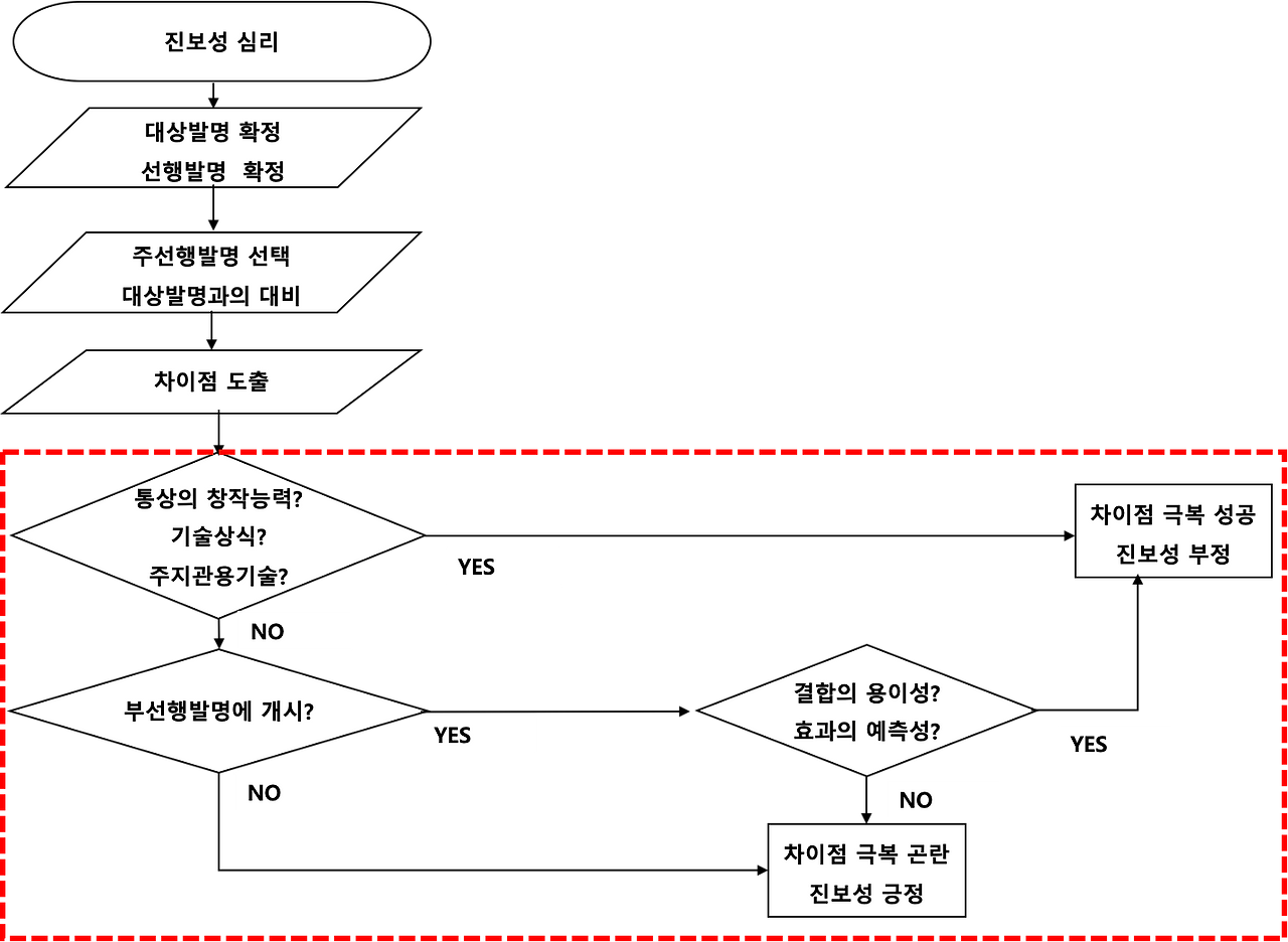 진보성 심리·판단에 있어서 핵심은 차이점을 극복하고 대상발명을 쉽게 발명할 수 있는지 여부에 관한 ‘5단계’이고, 이는 아래 순서도(flow chart)에서 박스로 표기한 부분이다.