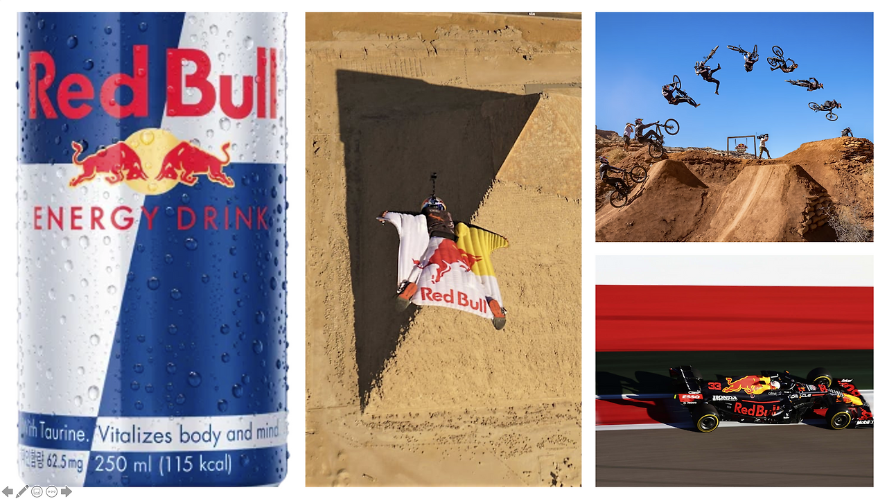 이를 위해 레드불은 자동차 레이싱팀과 각종 익스트림 스포츠 등을 적극적으로 후원하면서 미디어 콘텐츠를 만들고, 이를 홍보 수단으로 적극 활용하고 있다. 더 이상 레드불을 에너지 드링크 판매 회사로 제한할 수 없게 되었다.
