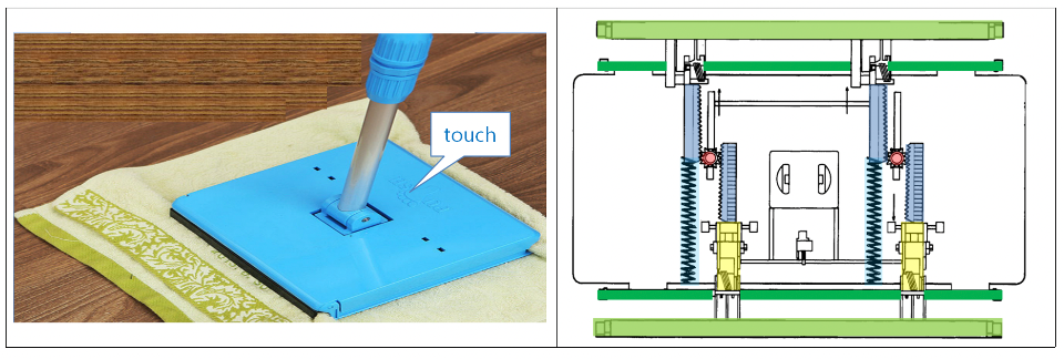 발명가 A는 물걸레 청소기를 사용하여 바닥을 청소함에 있어서 물걸레를 직접 끼우고 다 사용 후 해체시키는 불편함을 해결하기 위하여 뚜껑을 터치하여 쉽게 물걸레를 착탈시키는 물걸레 청소기를 개발하였다. 위 물걸레 청소기는 내부에 수평으로 삽입 고정된 스프링의 탄성력에 의하여 한 번의 터치로 뚜껑이 개폐되면서 물걸레가 착탈되는 것이다.