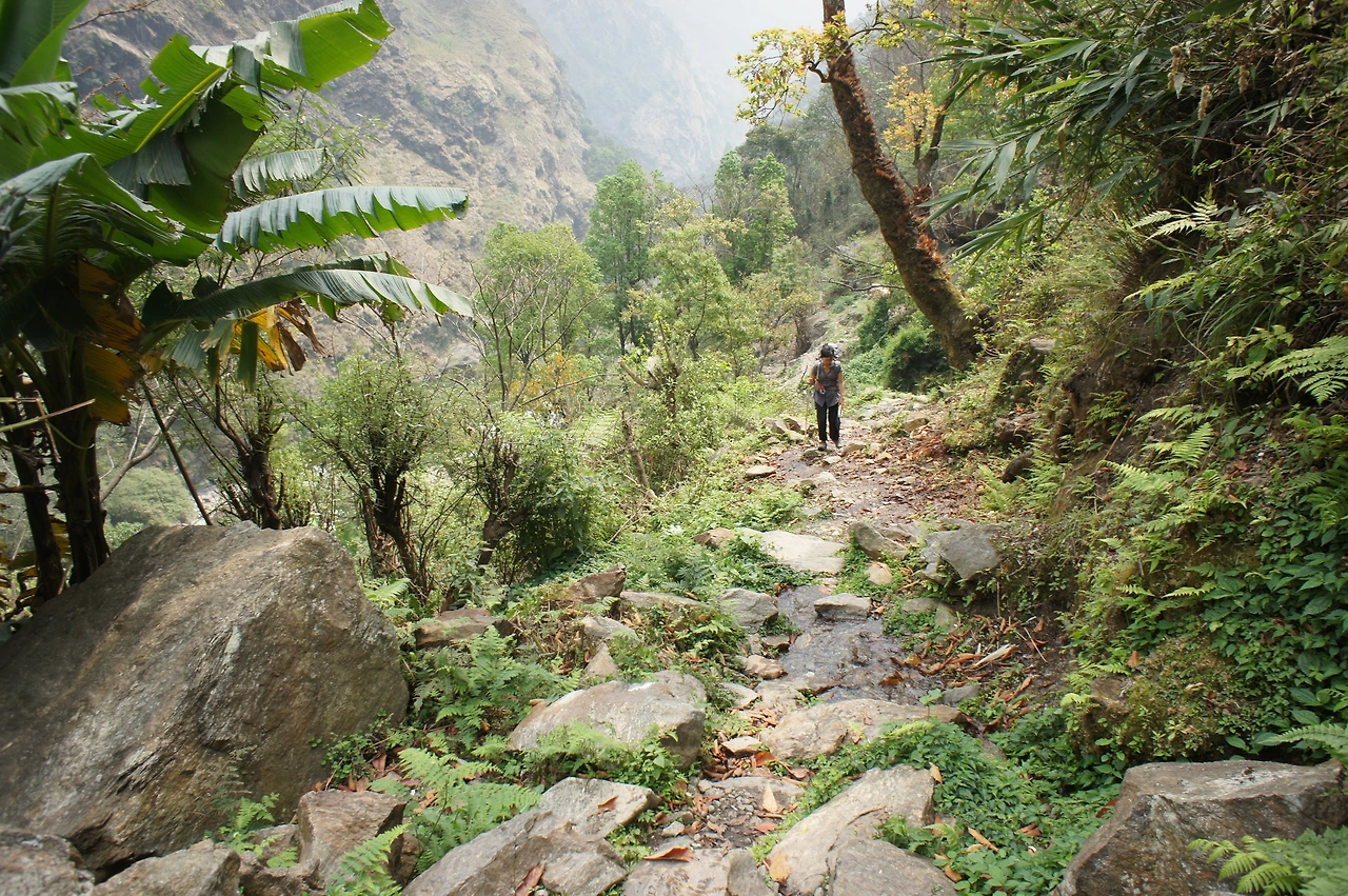우리는 푸른 나무들 사이를 걸었다. 설산은 언제쯤 보일까? 내가 물었다. 어디서 읽었는데, 안나푸르나 라운딩 코스는 해발 700m에서 시작해서 5,700m까지 올라가기 때문에 히말라야 사계절을 다 걸어볼 수 있대. 더스틴이 말했다. 그럼 우린 지금 여름쯤 걷고 있는 거야? 응. 그런 것 같아. 산세는 여름휴가처럼 수월하다. 안나푸르나의 여름을 쉬엄쉬엄, 네 시간 정도 걸으니 다음 마을에 가까워졌다.