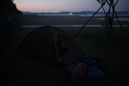 커플은 설마 텐트 안에 두 사람이 이렇게 나란히 누워있을 거라는 생각은 안 했는지, 아랑곳하지 않고 조잘조잘 대화를 잘만 나눈다. 일본어가 짧아 내용은 알아들을 수 없지만, 느낌 상 오래된 연인은 아닌 것 같다. 남자가 말하면 여자가 깔깔깔. 여자가 말하면 남자와 여자 모두 깔깔깔. 자정이 지난 조용한 해변가에서, 비록 수상한 연두색 텐트가 지켜보고 있긴 하지만, 둘이 앉아 시시껄렁한 이야기를 나누며 깔깔깔. 어둠 같은 아늑함. 파도 같은 간지러움. 아늑하고 간지럽게 이야기를 나누던 연인은 두 시간이 지나서야 자리를 떴다.