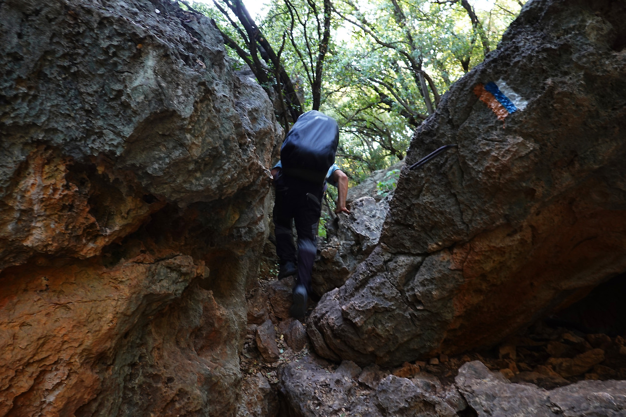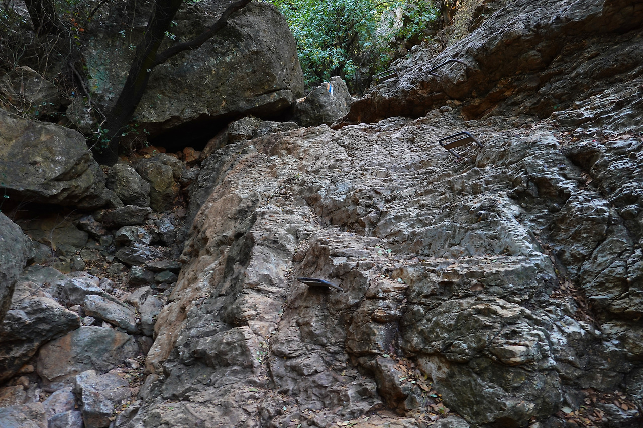 도로를 조금 걷다보니 다시 트레일이 나왔다. 트레일은 계곡 아래로 우리를 안내했다. 물이 마른 계곡길이다. 짧지만 암벽을 타야하는 구간도 통과했다. 조금 강해진 기분이 든다. 배낭을 메고 바위에 박힌 핸들을 잡고 오르는 나 자신이 자랑스럽다. 아, 세상은 아름답고 나는 강하고 배는 부르고 마실 물도 충분하고. 얼마나 좋은가.