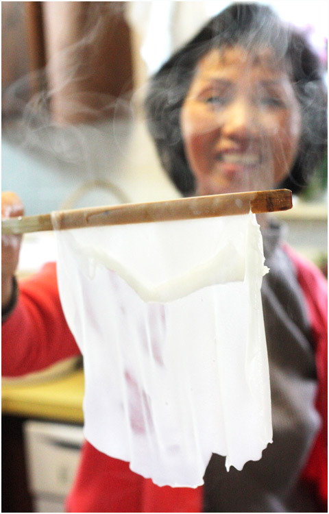 쌀 반죽은 아주 얇다. 약간 발효된 쌀 반죽을 사용하는데, 얼마나 얇은지 대나무 같은 기다란 젓가락으로 들어 올리면 투명해서 들고 있는 사람이 보일 정도다. 내가 정말 좋아하는 음식 중 하나인 새우 딤섬 하가우(蝦餃)의 반죽보다 더 얇다. 이렇게 얇게 쪄낼 수 있는 비결은 냄비를 둘러 팽팽하게 고정된 면 혹은 나일론 천에 있다고 한다. 손 두 뼘 정도 지름의 냄비 속 끓는 물의 열로 천 위에 펼쳐진 천만큼 얇은 쌀 반죽을 쪄내는 것이다.