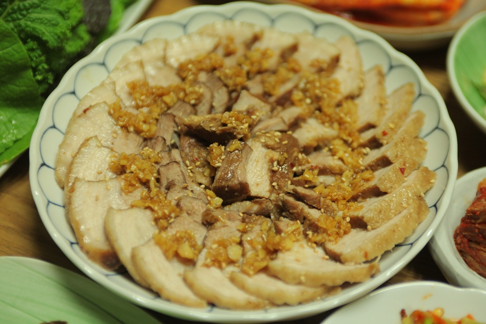 며칠 후 약속대로 신선한 통삼겹살 두 덩이를 구입했다. 두툼한 통삼겹살을 비계 부위가 옆으로 가도록 해서 두꺼운 냄비에 넣고, 물, 통후추, 양파, 대파, 마늘, 생강가루, 청주, 고추씨, 조선간장과 콜라를 조금 넣고는 두 시간 동안 삶았다. 생강가루는 생강을 늘 구비해두기 어려워서 말린 뒤 갈아놓은 것이다. 고추씨는 특유의 향과 칼칼한 맛이 돼지의 냄새를 잡아주기 때문에 사용하였다. 돼지고기를 삶을 때 보통 된장을 많이 사용하는데, 나는 주로 조선간장을 넣는다. 된장이나 조선간장이나 원재료가 같기 때문에 비슷한 효과를 나타낸다고 보면 된다. 오히려 된장보다 염도가 센 조선간장을 넣어서 돼지고기를 삶으면 은은하게 간이 배어서 더 맛있게 느껴지고 또 간이 밴 고기는 냄새도 덜 난다.