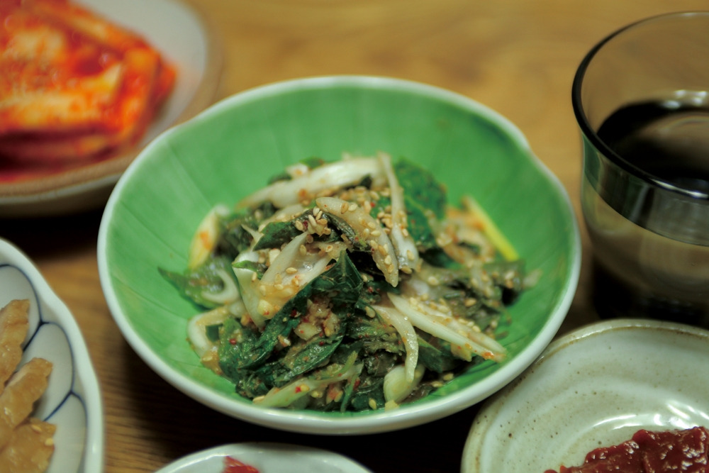 보쌈에 빠질 수 없는 배추 겉절이. 알배추를 반으로 잘라서 소금에 절인 뒤 김치냉장고에서 숙성 중이던 양념으로 재빨리 버무려냈다. 나는 깍두기 만들고 남은 양념을 김치냉장고에 넣어두고 급할 때마다 동원한다. 풋마늘도 데쳐서 무쳐 먹고, 이렇게 알배추도 무쳐 먹는다.
