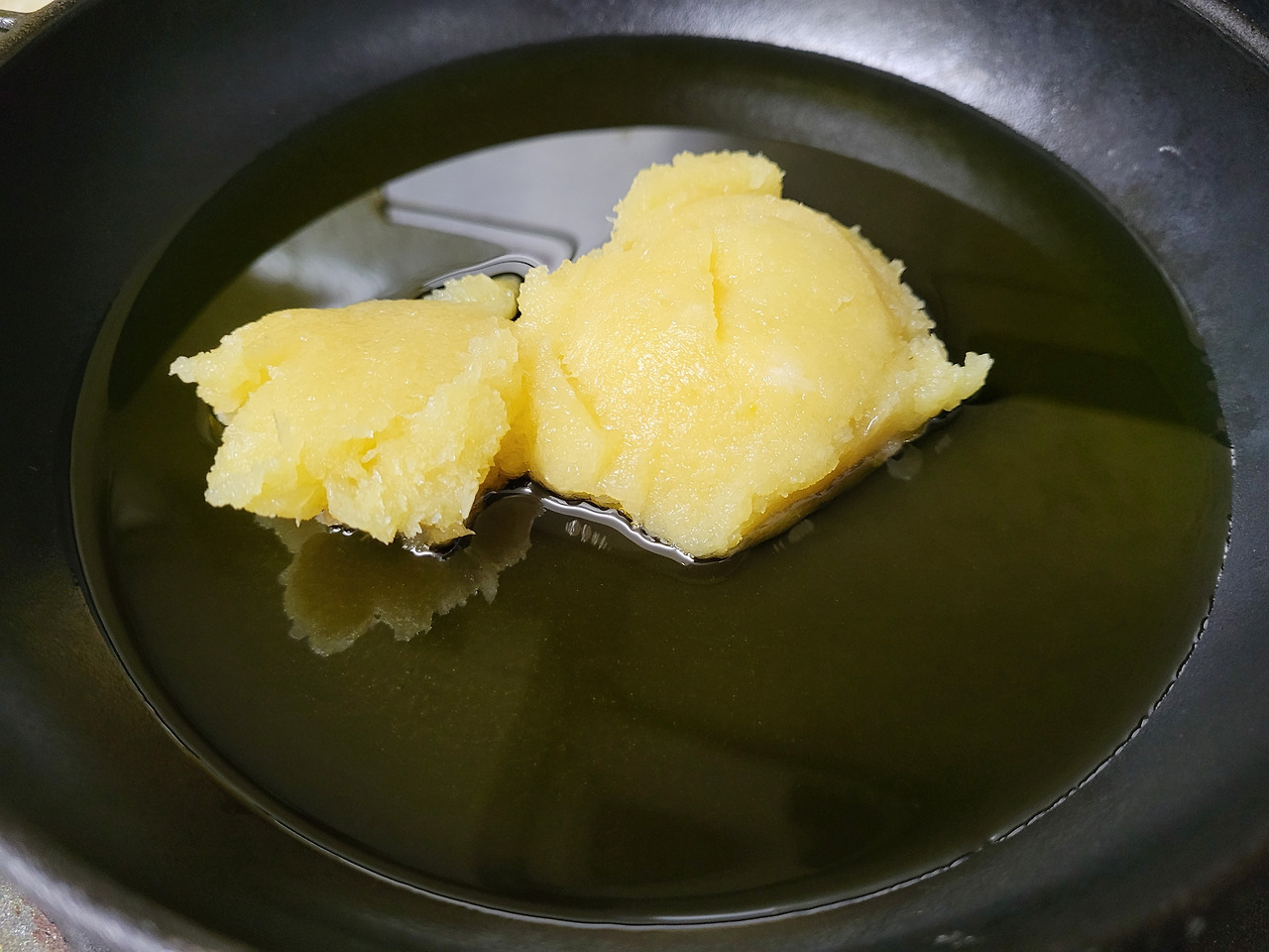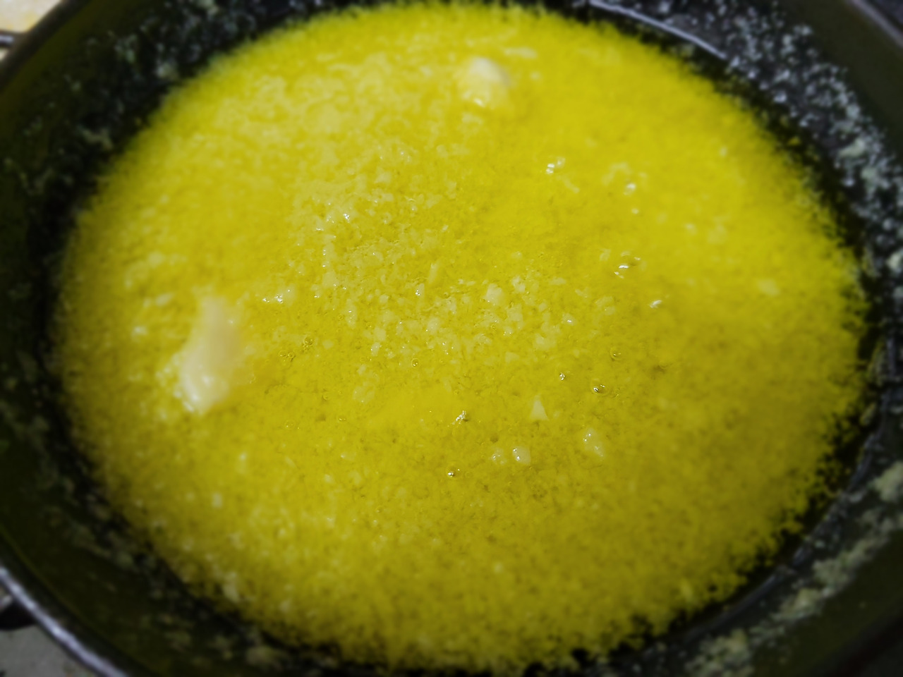 7. 간마늘을 가득 넣은 뒤, 오일에 마늘 향이 배도록 익혀줍니다.