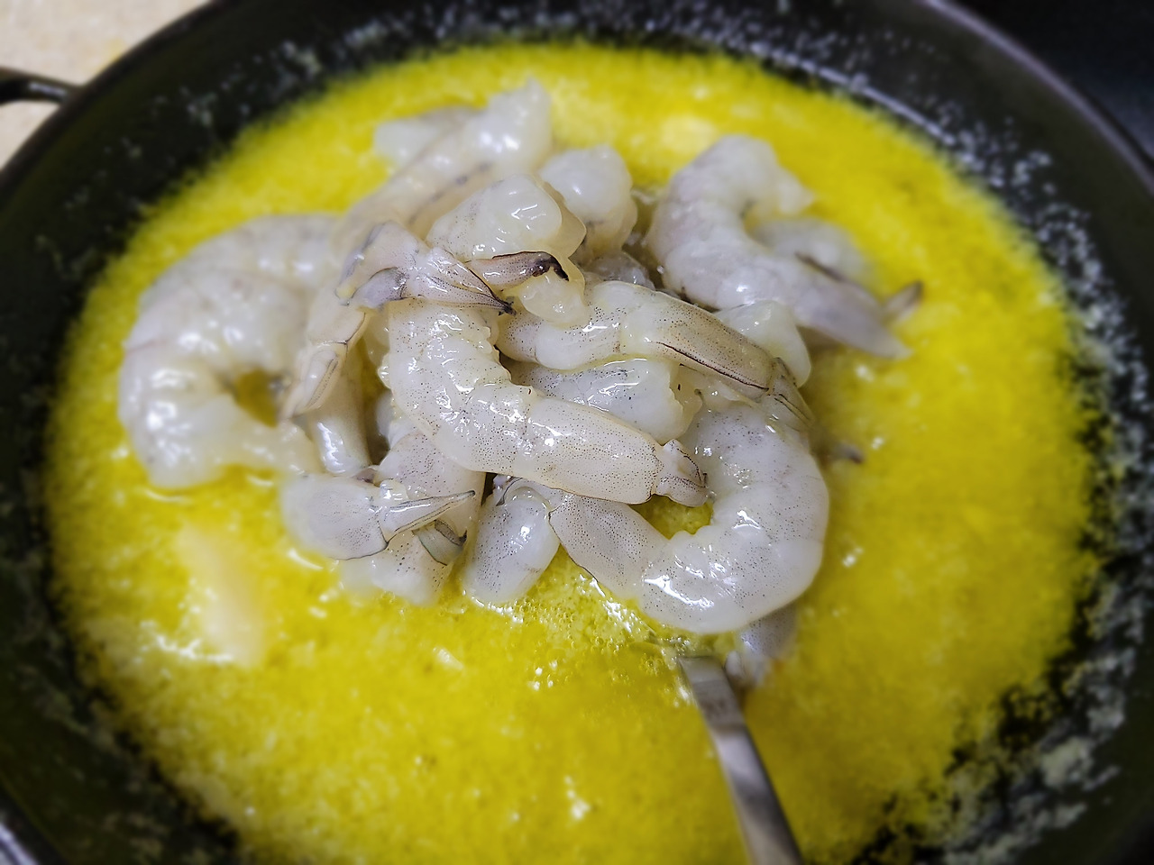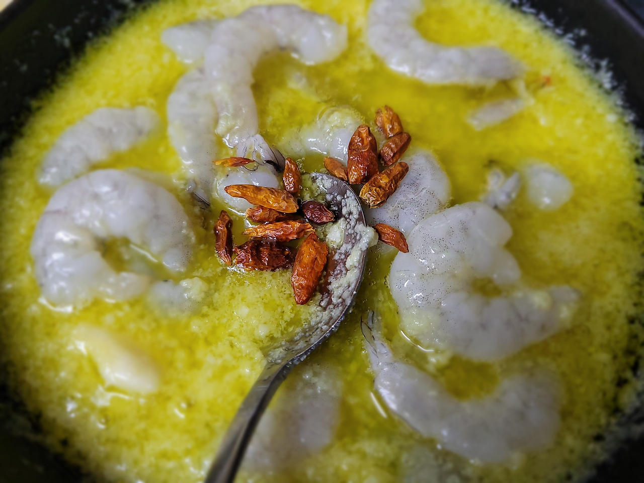 8. 오일이 끓기 시작하면, 새우를 넣어줄 차례예요.