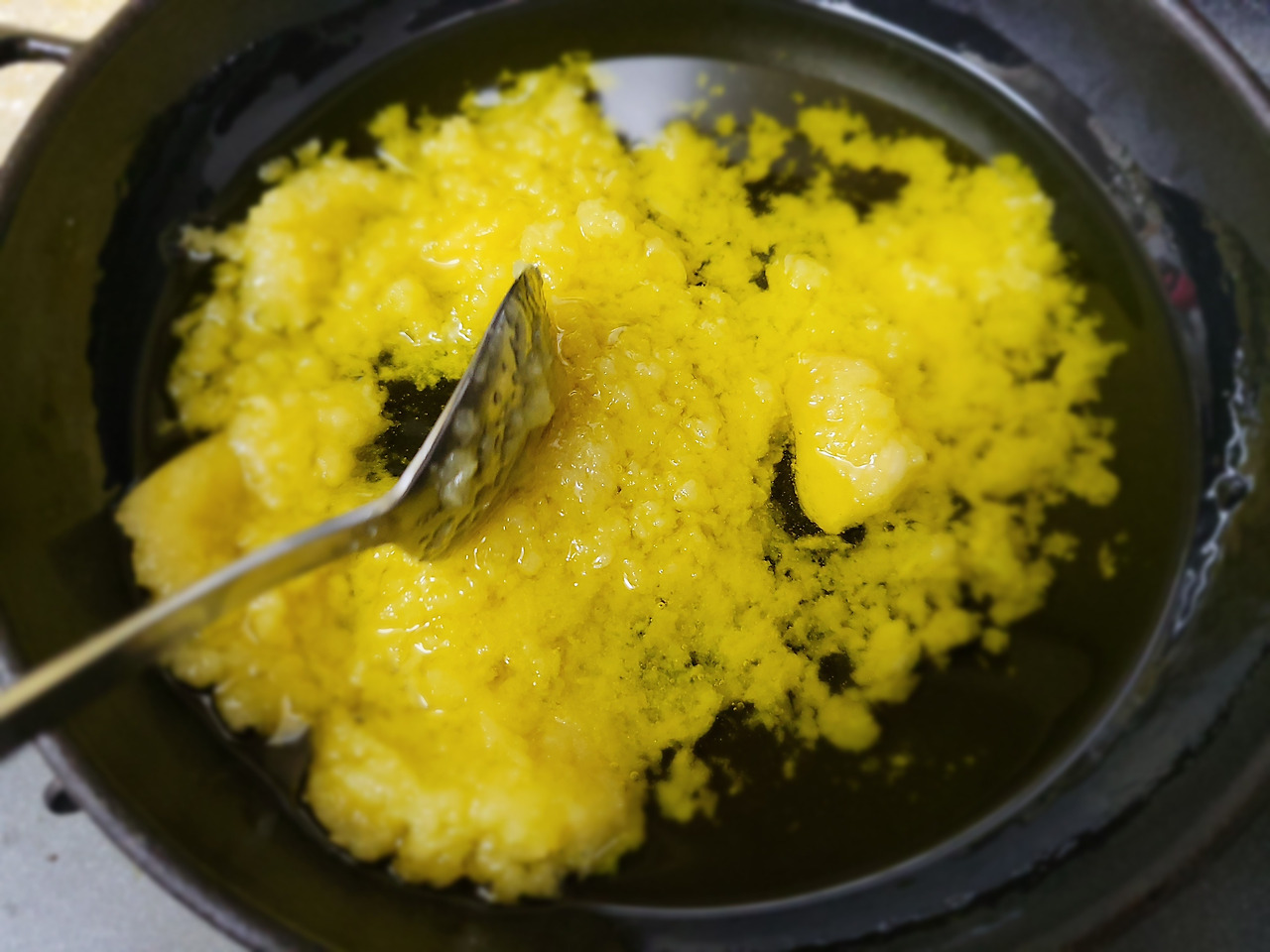 6. 먼저, 프라이팬에 새우가 잠길 정도로 올리브오일을 한가득 붓고 약불에 끓여줍니다.