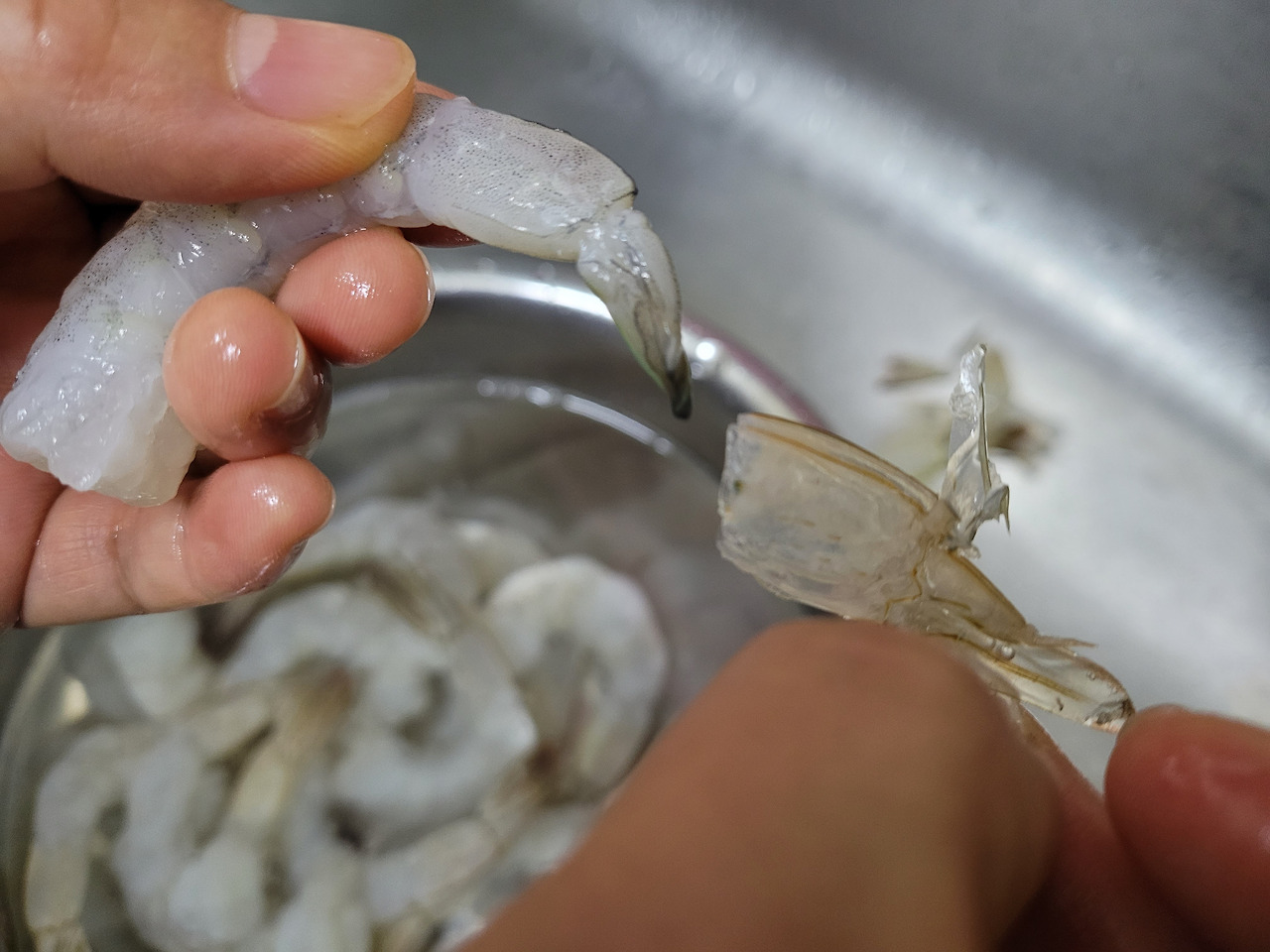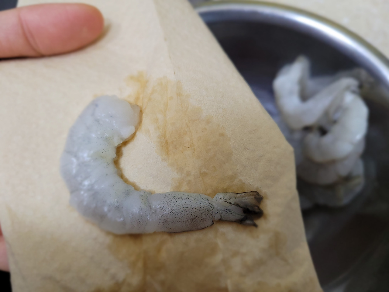 2. 해동이 끝나면 새우 꼬리 껍질을 먹기 좋게 벗겨줍니다.