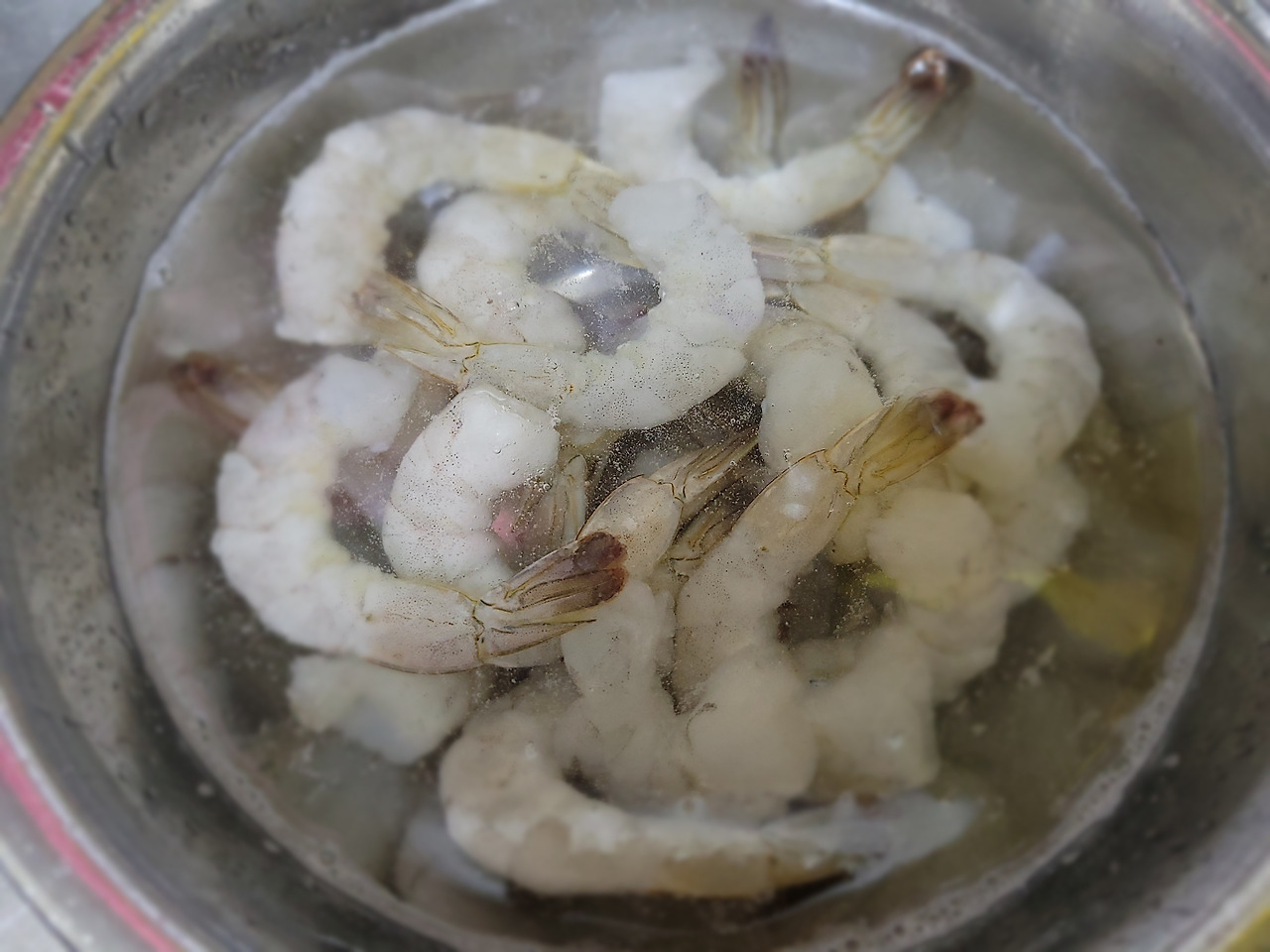 1. 냉동 새우를 20~30분간 물에 녹여 해동하며 짠기를 빼줍니다.