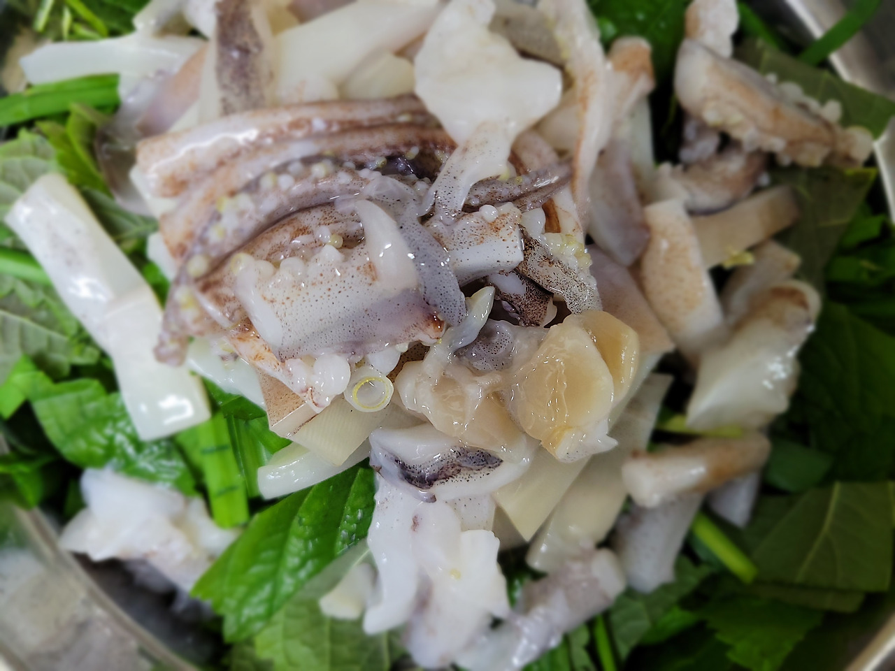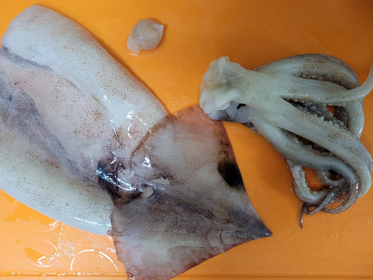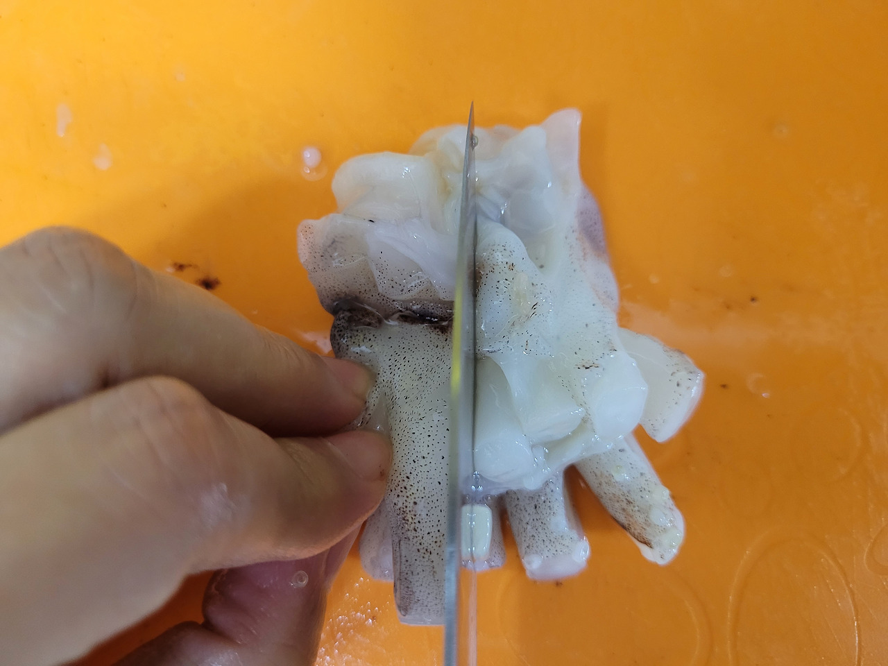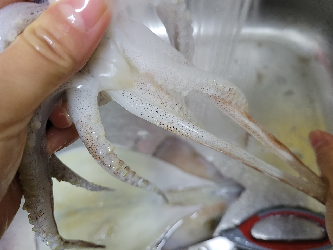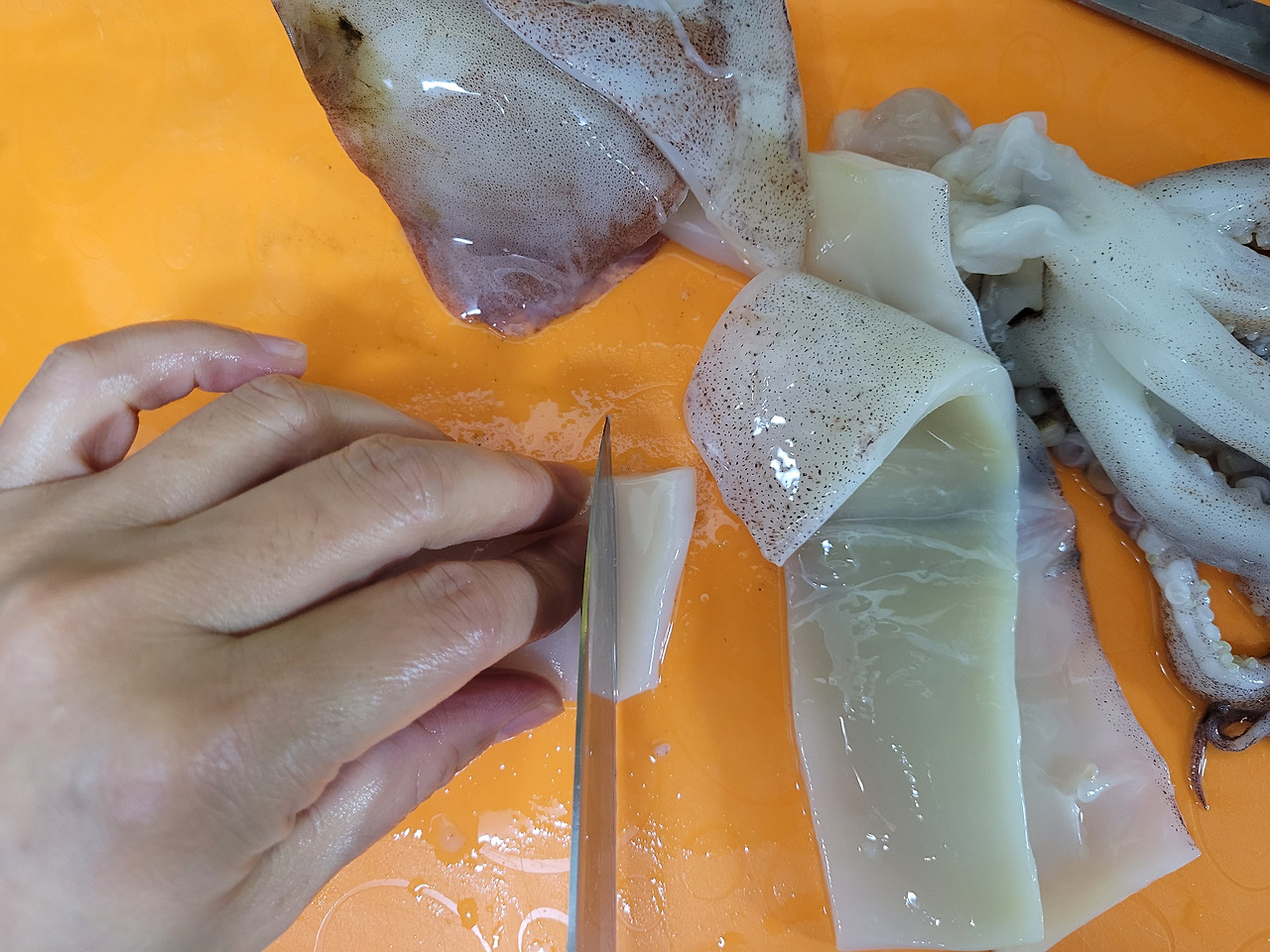 10. 오징어를 깨끗이 씻어줍니다. 다 씻었으면 몸통, 다리, 입을 먹기 좋게 썰어볼게요.