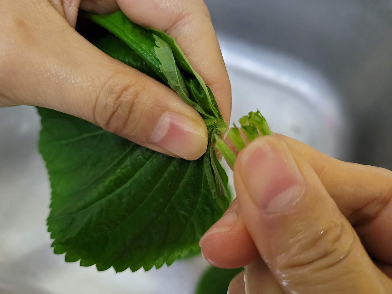 2. 오징어 부추전에 깻잎이 들어가면 더욱 맛있어요. 깻잎 꼭지를 떼서 한 장씩 씻어줍니다.